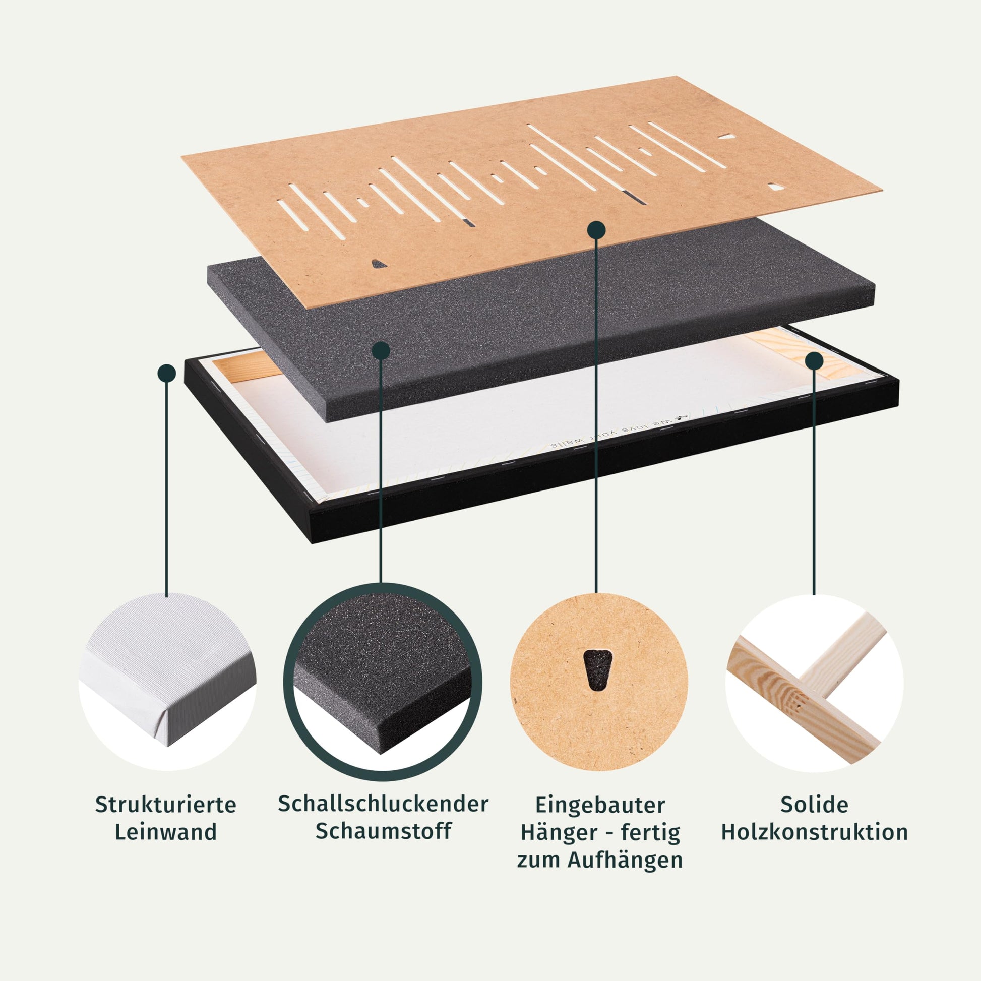 ["Total format: Dimensions of the acoustic pictures APPROX: 24x36 inches (WxH). Our wall decoration is available in various sizes.","Room acoustics: Acoustic panels ensure better sound insulation in any room. They reduce reverberation and noise levels. The more acoustic pictures hanging on the wall, the better insulation can be achieved.","Features: High-quality, durable material. Wall picture on textured canvas, stretched on the wooden frame and filled with acoustic foam. Additionally, the HDF board at the back. Overall thickness of 2.6 cm. Excellent as sound absorber.","Installation: Ready-to-hang wall pictures, easy installation thanks to practical openings for sawtooth hangers. The room acoustics are immediately improved with the sound-absorbing picture with little effort.","Decoration: Unique combination of functionality and design! Modern pictures for tasteful wall decoration in the bedroom, living room, or office. The soundproof pictures are also suitable for recording studios, meeting rooms, or practices.","Colors: Our canvas art prints are lightfast and odorless. They are characterized by deep and intense colors. The edges of the picture are printed in the motif colors as standard, so no additional frame is required.","Accessories in the form of nails are included with the acoustic pictures. The quantity depends on the size of the respective picture."]