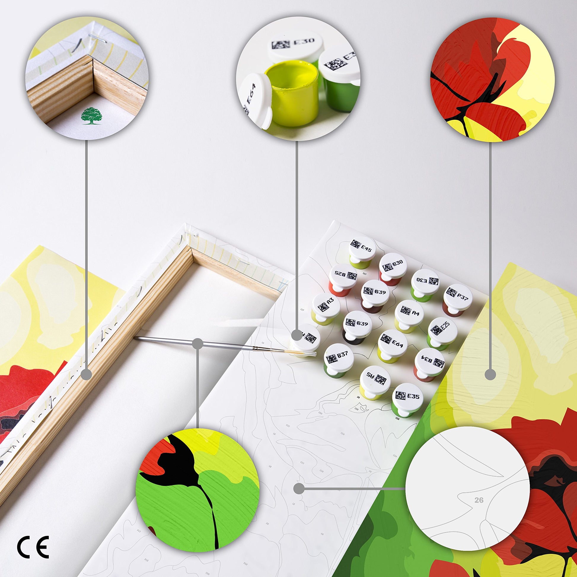 ["PREMIUM MATERIALS: professional paint brushes, acrylic paints, high-quality canvas on wooden stretcher frame. Thanks to the smooth surface, painting becomes easier. In the end, even more beautiful!", "MODERN DESIGN: Rich color palette composed by our artists for you. No need for paint mixing! Clear field contours, perfectly readable numbers, and acrylic paints ensure the best image reproduction", "READY TO HANG: The canvas is stretched on sturdy wooden frames and secured with staples. If you paint the side edges in motif colors, your painting will gain a modern look", "DETAILED INSTRUCTIONS: The entire painting process described step by step & accompanied with detailed photos. Expert tips & overview of painting techniques. All easily explained - perfect for beginners!", "TOP QUALITY: You acquire a high-quality EU product from us, certified with CE marking", "OVERALL SIZE: approx. 50x40 cm (WxH) - one piece on premium canvas"]