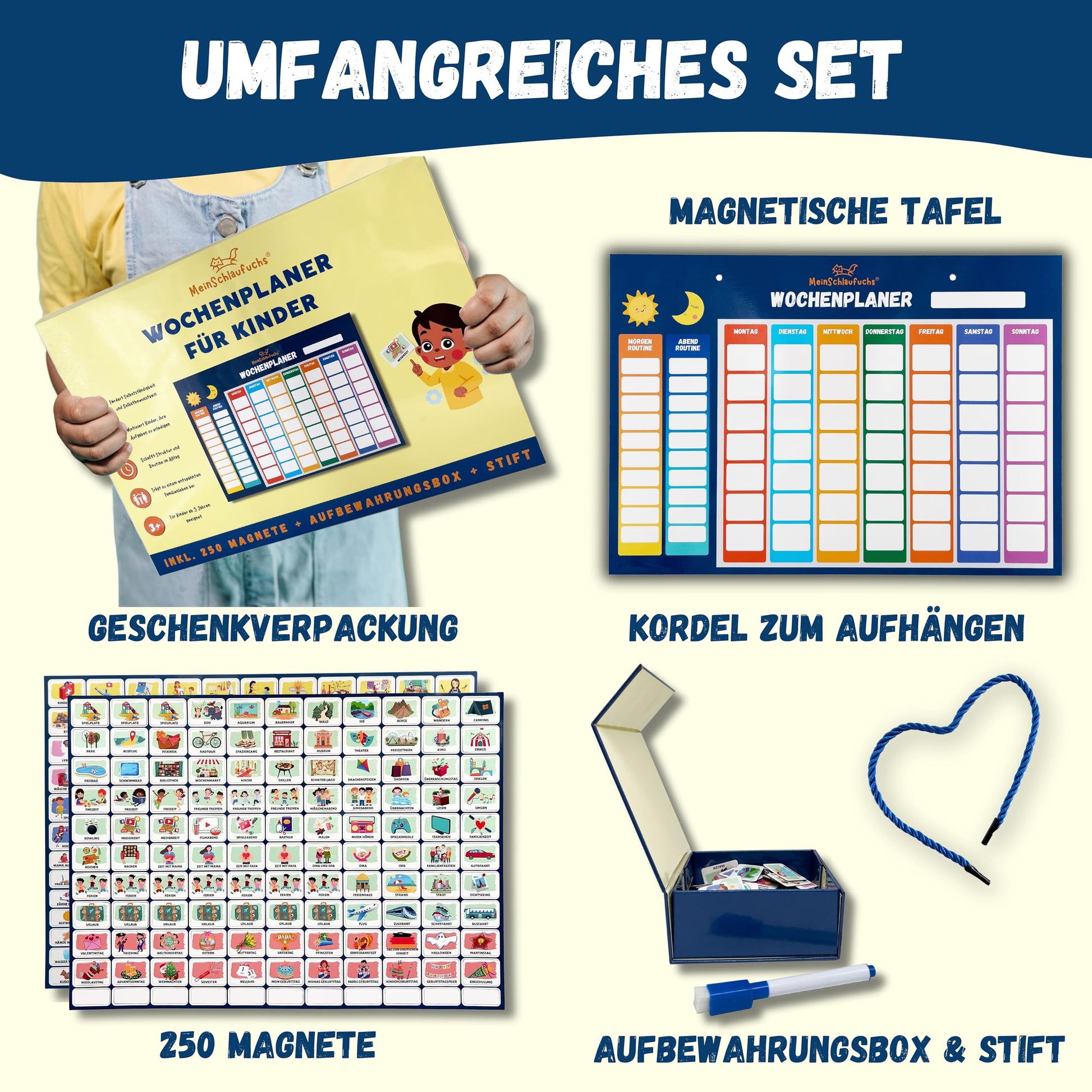 ["🌟 COMPREHENSIVE SET: MySchlaufuchs weekly planner for children includes a beautiful magnetic board with a string for hanging, a pen, a variety of activity magnets, and a practical storage box to keep the magnets organized, tidy, and within easy reach.", "🚀 PLAYFUL PROMOTION: Our Montessori-inspired weekly planner brings structure to your child's daily routine, promotes independence and accountability, motivates children to complete their tasks with joy, and makes planning the week a playful learning process through child-friendly design.", "☀️ INTEGRATED ROUTINE PLANNER: Thanks to the integrated morning and evening routine planner, your child not only keeps track of the entire week but also plans daily recurring tasks and activities - for a stress-free start to the day and a relaxing evening.", "🎨 VERSATILE MAGNETS: A total of 250 magnets are available for planning various activities. Of these, 215 magnets are beautifully illustrated and are easily understandable even for children who cannot read yet. Additionally, there are 35 blank magnets for customization and 2 day-of-the-week magnets. Let your child create their own week!", "🇩🇪 GERMAN COMPANY: Our products are safe, lab-tested, and designed to support children's cognitive, emotional, and motor skills. As a German company, we guarantee quality and excellent service. Customers have the opportunity to test each product without obligation and return it easily if needed."]