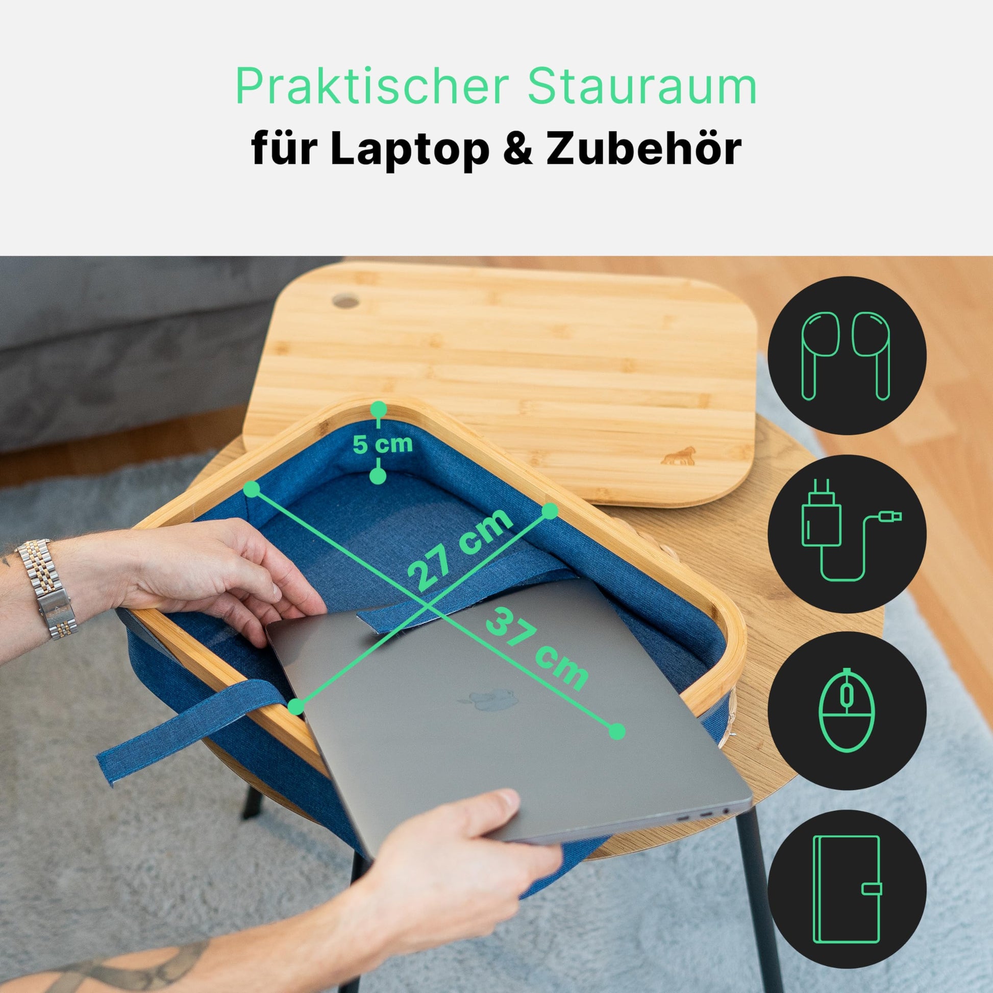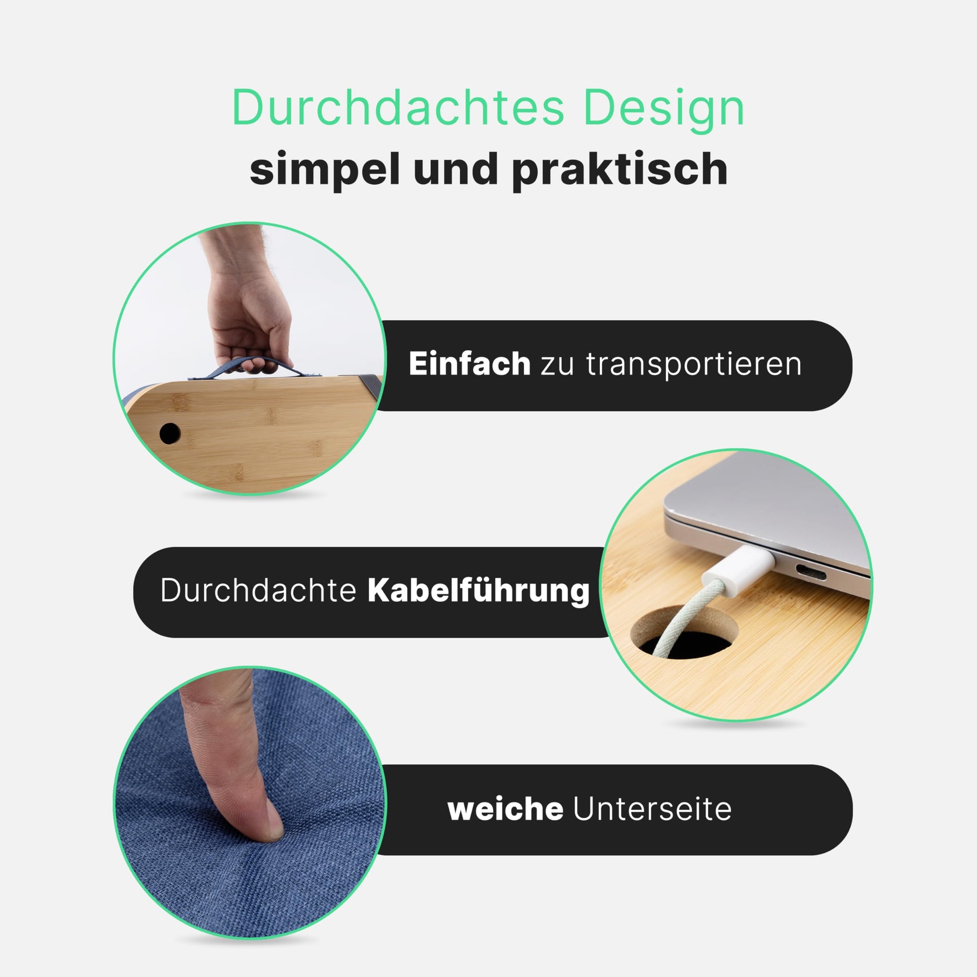 "Home office everywhere - Finally a change from the desk with the mobile laptop stand with high quality bamboo surface and ergonomic elevation.