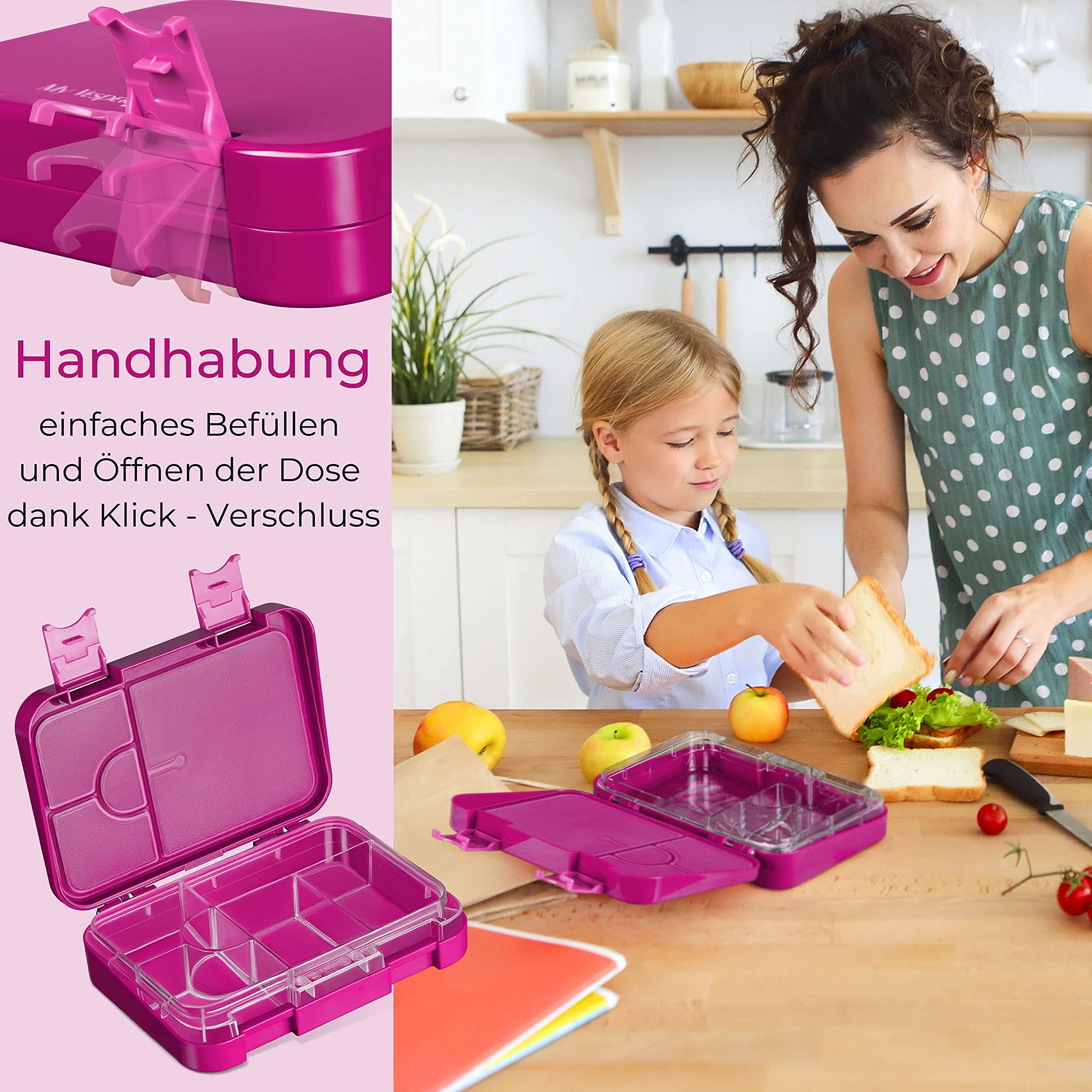 ["THE FULL SAFETY - Our lunch box is of course proven to be free of any harmful substances like BPA and plasticizers. (LFGB certificate available)", "EXTREMELY DURABLE - Thanks to its solid construction and reinforced locks, the lunch box is extremely robust. Fall test approved!", "CHILD-FRIENDLY LOCKING – The diagonally running closure edges guarantee easy opening and make the My Vesperbox the perfect companion for your children.", "FLEXIBLE WITH 4 OR 6 COMPARTMENTS? – the lunch box can be equipped with an additional container as needed, providing 4 or 6 practical compartments.", "CLEAN SEPARATION – Seals are located in the lid of the bento box to prevent food from mixing. (Caution! This does not apply to pure liquids)"]
