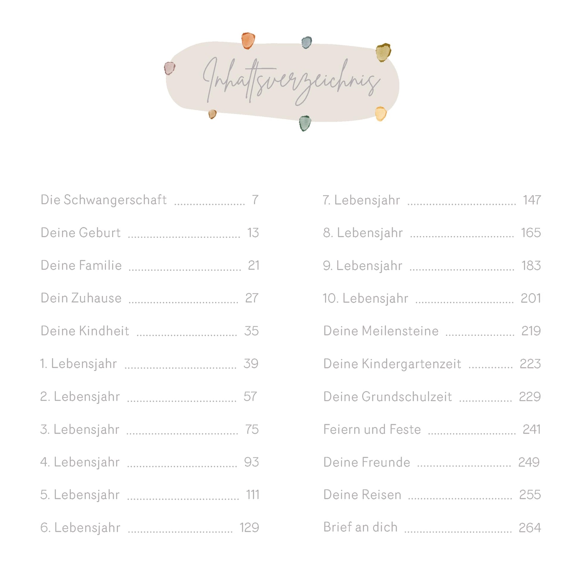 ["MEMORIES FOR ETERNITY: On 264 lovingly designed pages, you can capture all the milestones of your child's first 10 years and keep them in memory forever. The childhood book offers plenty of space for the most beautiful photos and memories, for special celebrations, milestones, birth, first teeth, starting school, and much more.","GIFT FOR BIRTH: Suitable as a perfect gift for birth to capture the first 10 years of life.","HIGH QUALITY: The memory album is gold-plated on the cover and spine. The book is very high quality, thanks to thread stitching, sturdy hardcover, and the best natural paper quality. Size: 22 x 22 cm, 264 pages.","DESIGNED BY PARENTS FOR PARENTS: The book was designed by parents with attention to detail.","100% HAPPY GUARANTEE: We are happy when you are. If something is not right, we will find a solution together. Your satisfaction is our top priority."]
