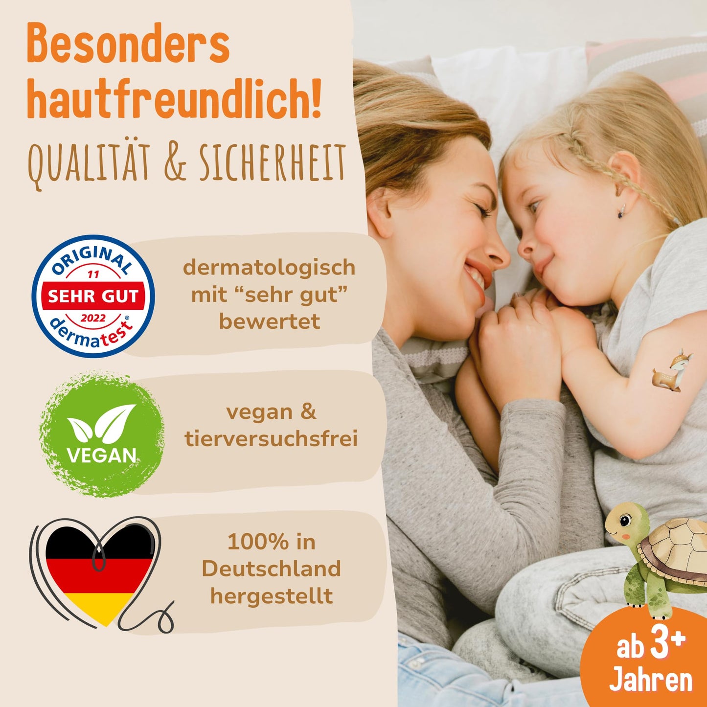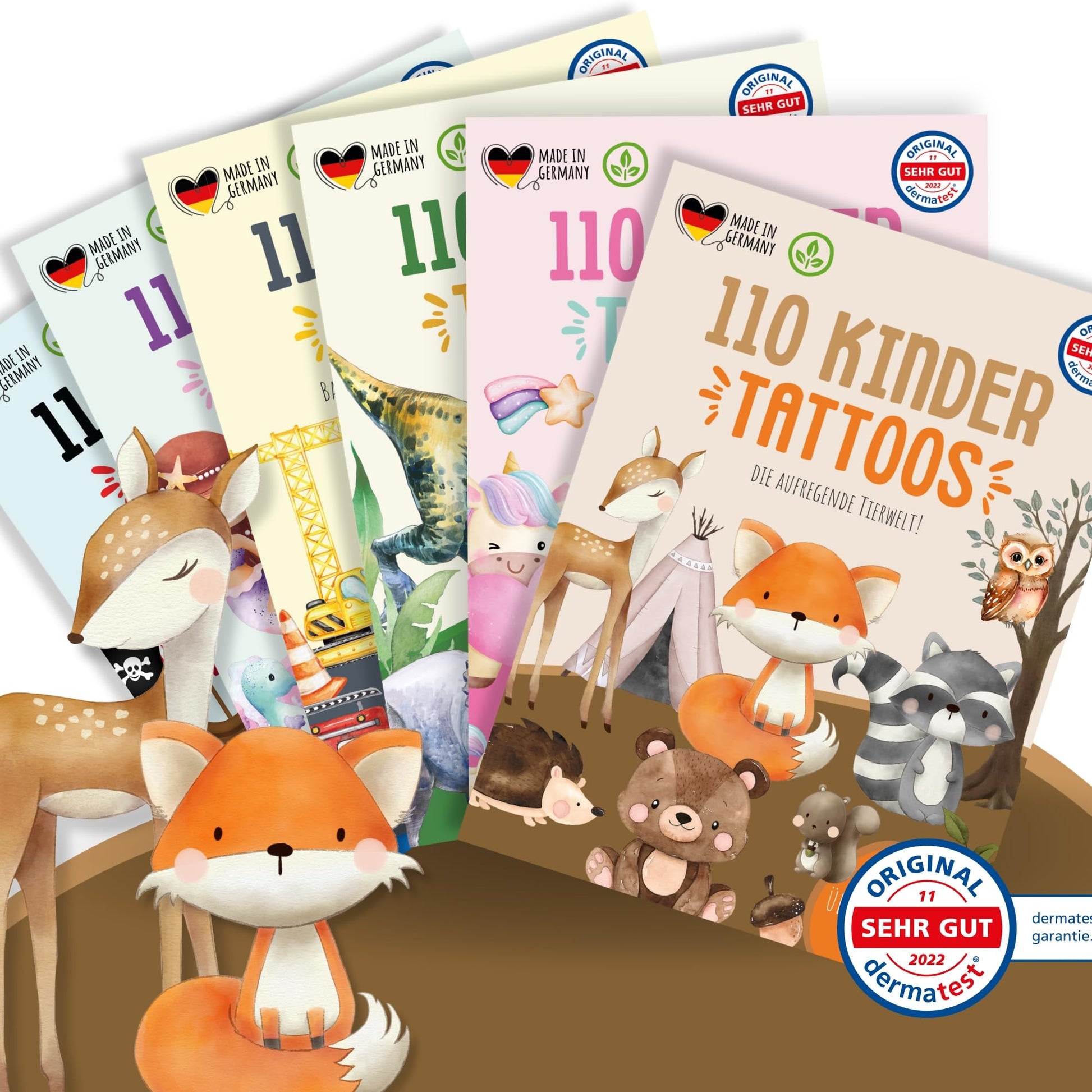 "✅ DERMATOLOGICALLY VERY GOOD: Our cute children's skin tattoos are made of high-quality premium quality, dermatologically tested as "very good" and especially skin-friendly. They are easy for kids to apply and can be removed just as gently from the skin.