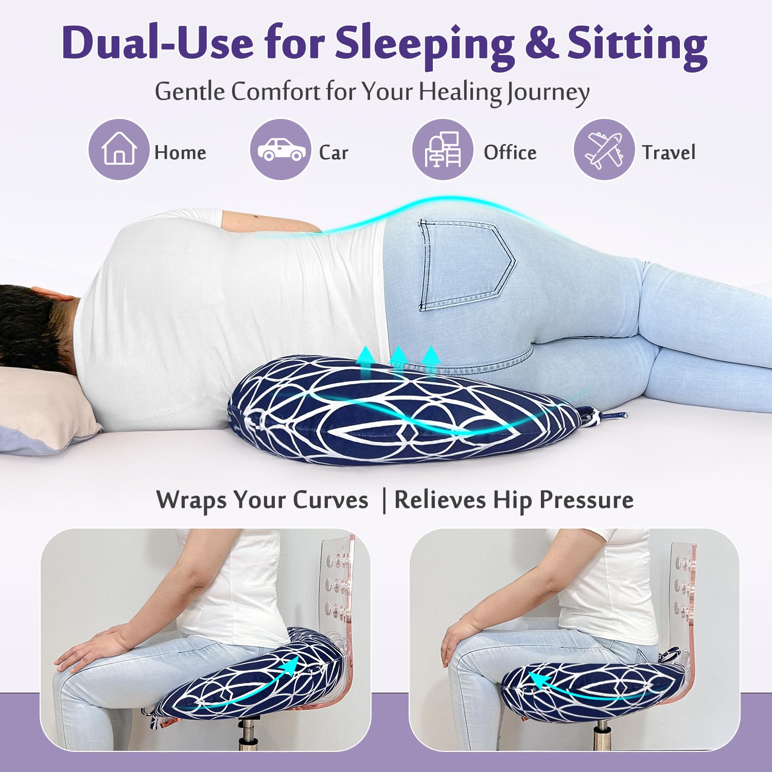 Multipurpose body pillow: The round cushion with cavity is good for postoperative recovery after Brazilian butt lift or hemorrhoid treatment; also great as a body pillow for adults suffering from hip pain, fibromyalgia, sciatica, poor posture, athletes, people in physiotherapy, or recovering from an injury.