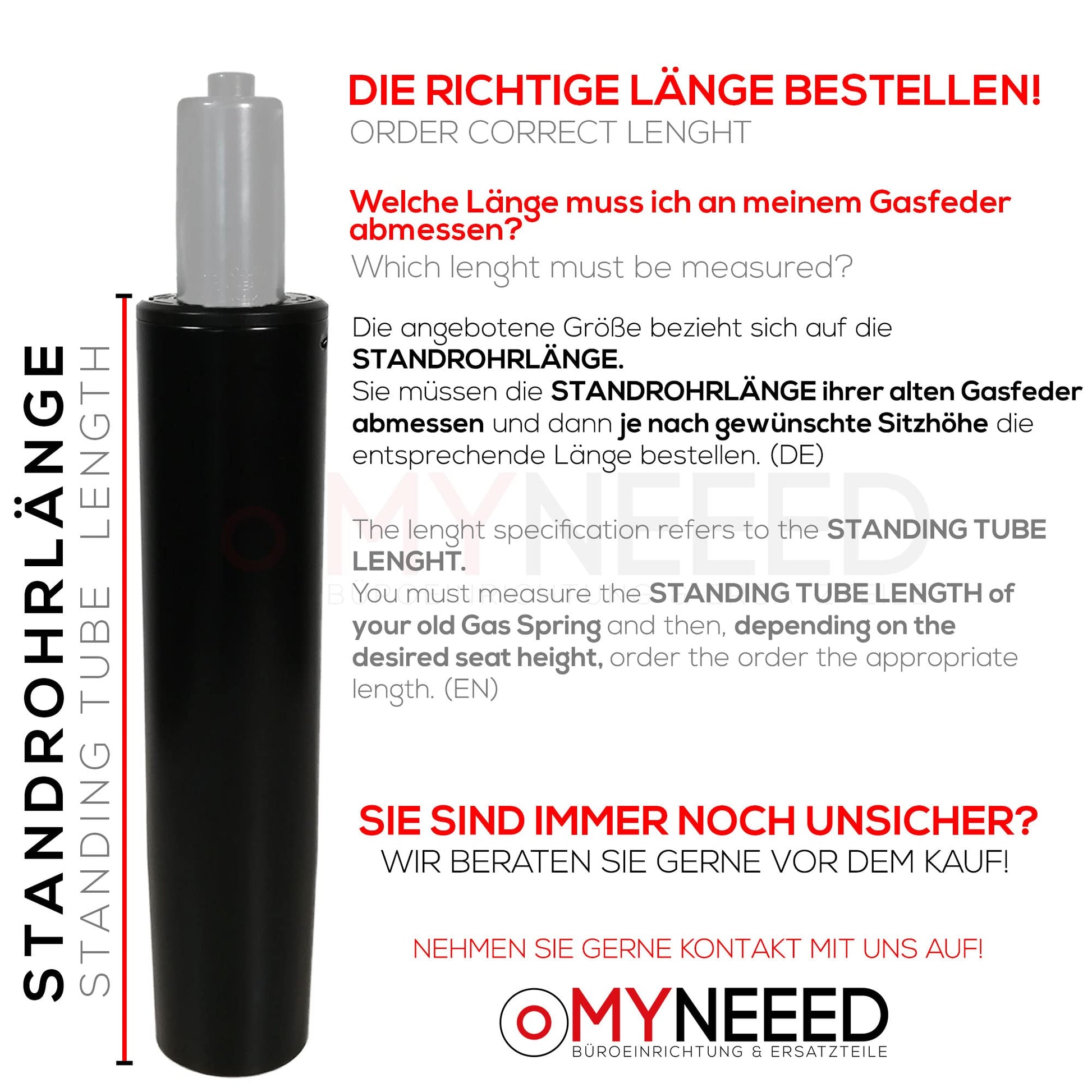 ["EXTRA STABLE GAS SPRING - MYNEEED gas spring office chair replaces the defective spring on your office chair, ensuring smooth height adjustment and more stability due to the high safety class","HIGH LOAD CAPACITY - The gas cylinder has a load capacity of up to 440 lbs due to its sturdy construction, no pressure loss due to special compression, resulting in a longer lifespan","HIGH QUALITY & COMFORT - The integrated depth suspension provides a springy, relaxed sitting feeling and protects the spine by avoiding impact when sitting down","ESPECIALLY EASY ASSEMBLY - The conical lower and upper parts make it easier to assemble the gas spring. You will receive a disassembly guide for the old gas spring for free with the delivery","TESTED & CERTIFIED - Our gas springs for office chairs are TÜV, GS & LGA certified. Please pay attention to the correct housing length when selecting. You will find an infographic below the images"]