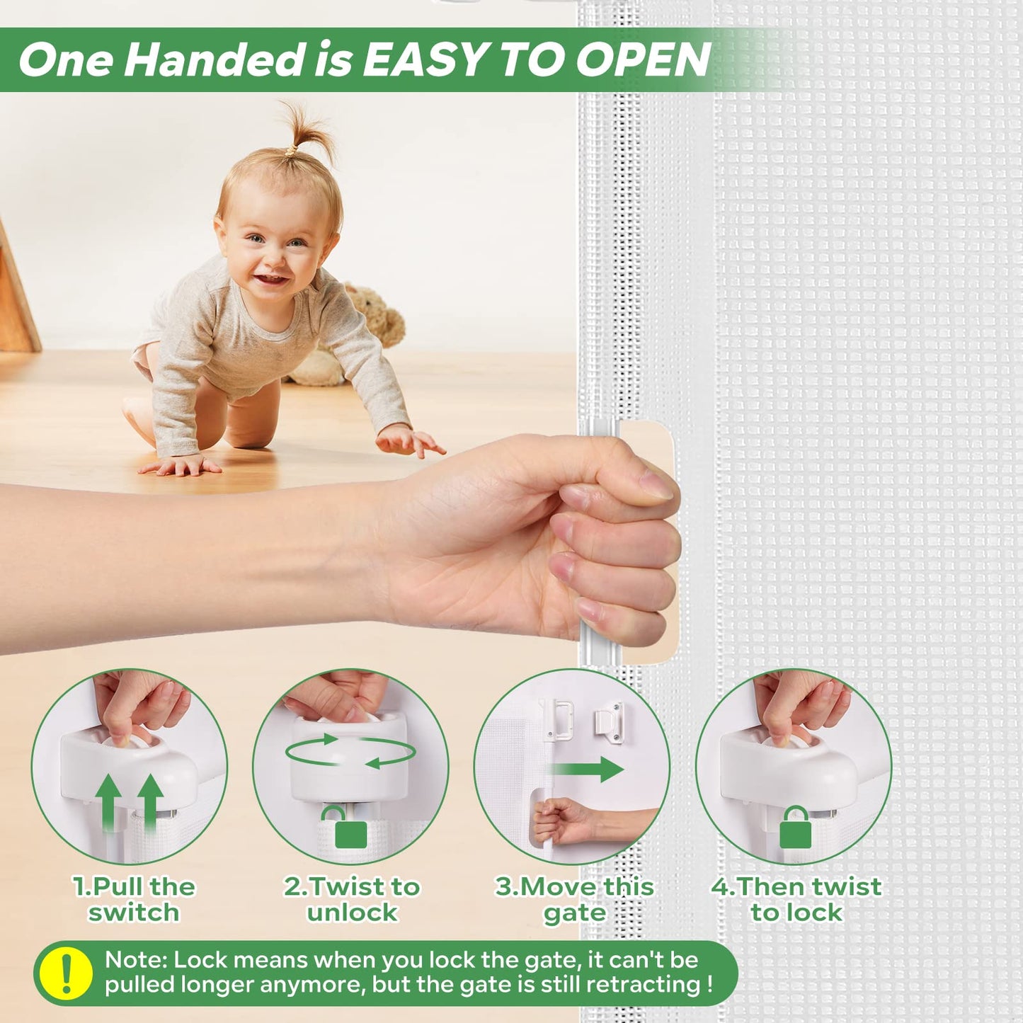 ["140cm wide retractable baby gate: The extra wide retractable gate is 86 cm high and up to 140 cm wide. The retractable design allows the baby gate to be adjusted at any angle. Ideal for various wide gates, hallways, stairs, or entrances, suitable for indoor and outdoor use. (The baby stair gate includes components for easy installation.)","One-handed operation: Simply press and twist the ball cap to lock and unlock the gate with one hand. All of this makes it super convenient to use when holding a baby or carrying around toys or diapers. With a roll pin made of aluminum alloy that retracts smoothly.","High-quality safety: This MYPIN baby gate roll is made of high-quality, sturdy, and durable ABS plastic. It is stable enough and does not give in easily. It can withstand the pulling force of babies or small pets. It can protect children from accidents and falling down the stairs.","Removable door safety gate: Unlike traditional metal safety gates that are fixed after installation, this MYPIN baby gate is removable and can be moved with the provided 2 sets of mounting hardware. You can easily clip on and remove the safety gate to use it in more than one location (do not install at the top of the stairs).","Retractable design: This baby stair gate provides a versatile safety solution for home, allowing for easy use in high-traffic areas without cumbersome disassembly and adjusting to fit any door width up to 140 cm. It is convenient and space-saving.","Smart-Off feature: Along with a two-way swinging door, this baby gate for stairs and other areas of the house automatically closes at 30 degrees to prevent children from trying to sneak behind you as you pass through."]