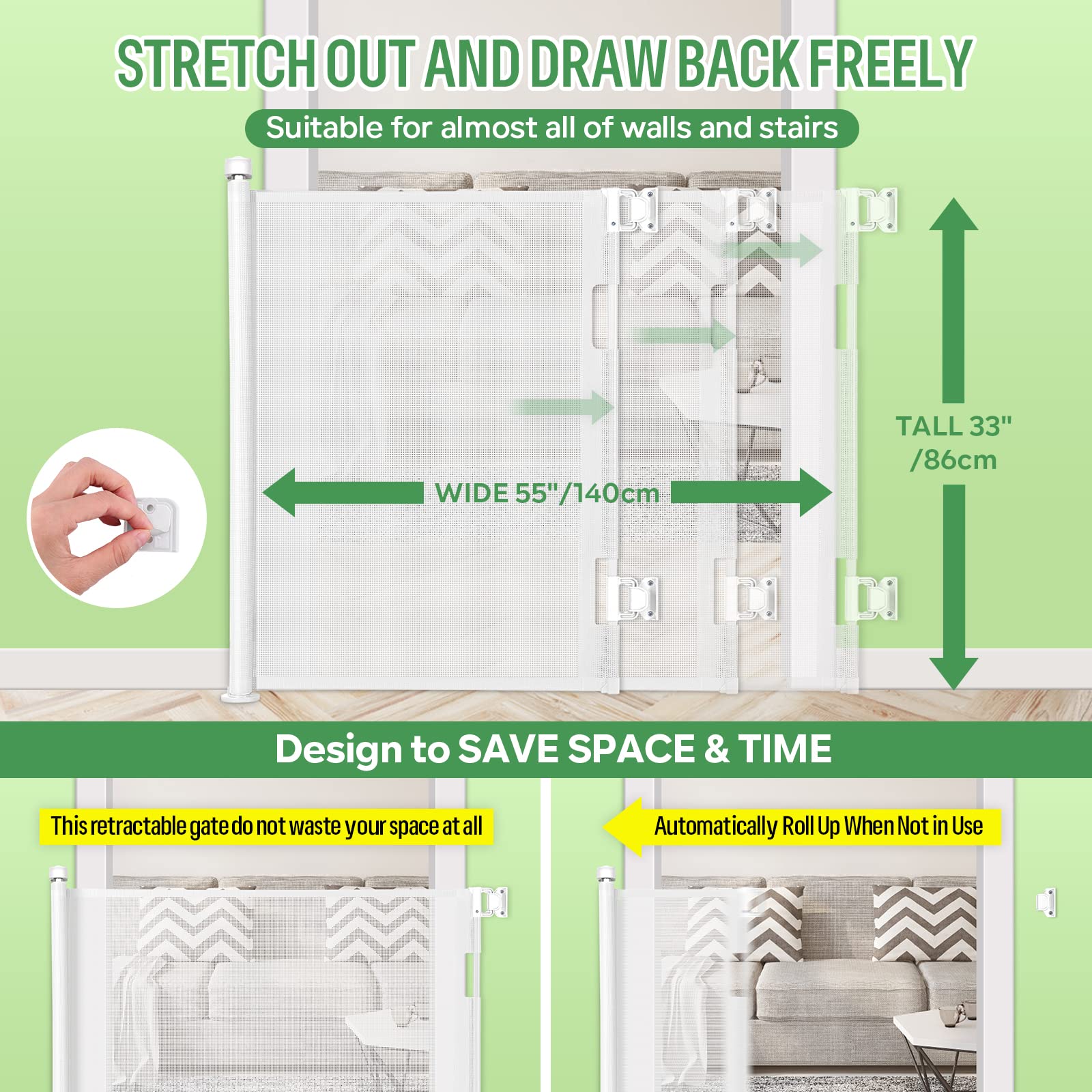 MYPIN Retractable Stair Gate for Baby Pets, Baby Gate 0 to 140 cm, 33 x 55 inches, Extra Wide Safety Gate, Dog Gate for Stairs, Hallways, One-Hand Operation, Easy to Clean, White.