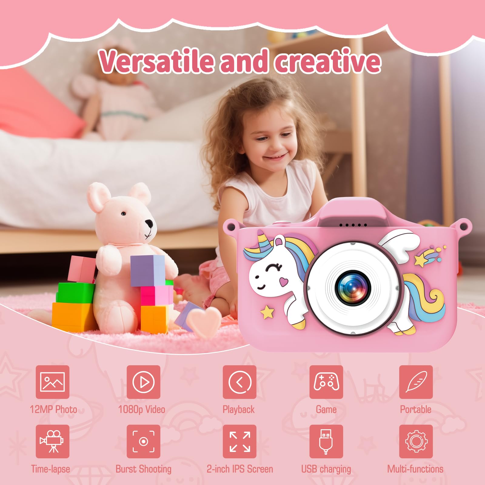 "Perfect gift for boys and girls. This cute unicorn kids camera is the ideal gift for children ages 3-12 for Christmas, birthdays, New Year, or holidays. With selfie and video mode, as well as five built-in puzzle games, it promotes children's creativity and imagination and improves the parent-child interaction atmosphere."