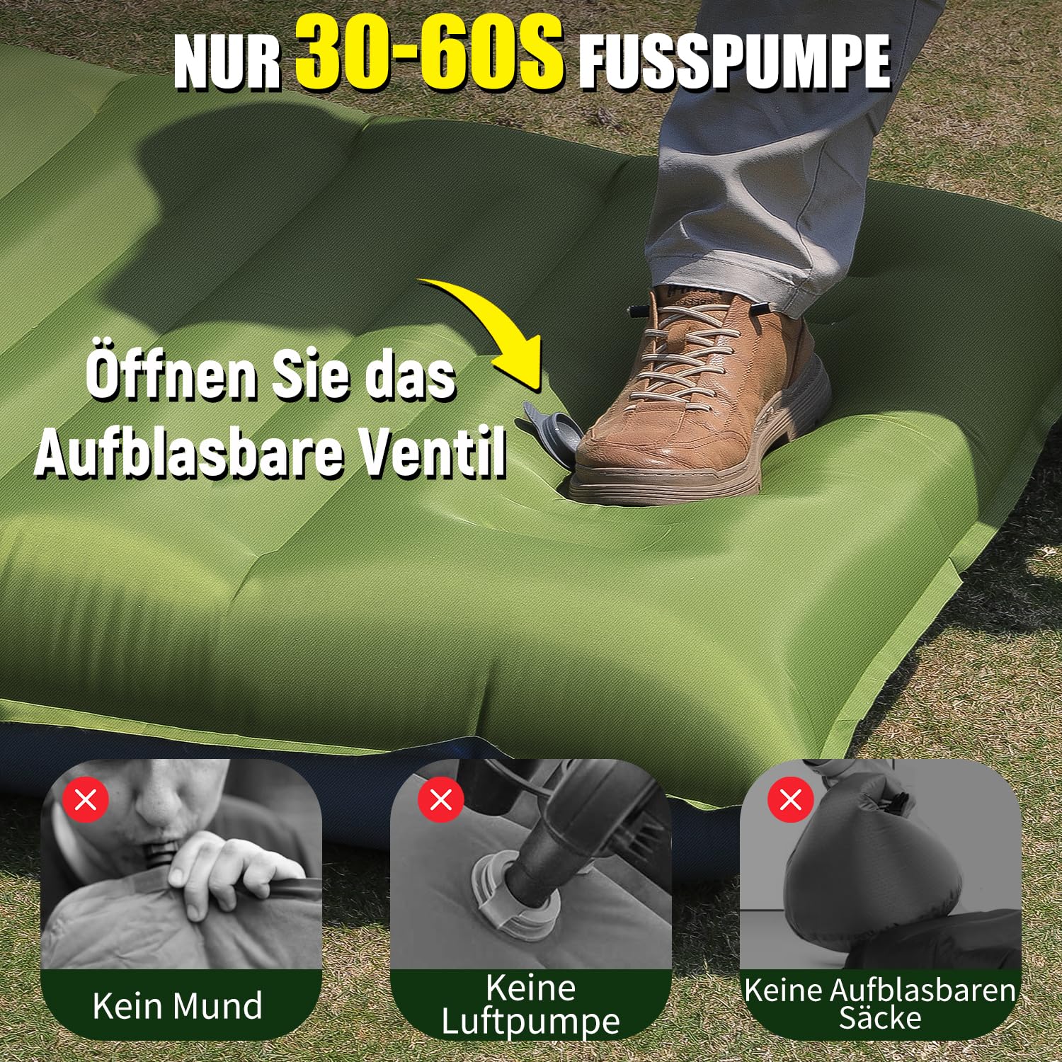 ["Quick Inflation & Deflation"] In just 30 to 60 seconds, the Myxslop air mattress can be fully self-inflated with the built-in foot pump. You don't need to inflate it with your mouth, hands, or a pump. It is convenient and simple. Deflating the camping mattress quickly takes only 1 second. The improved version of the deflation valve has leak protection, so you no longer have to worry about leaks!