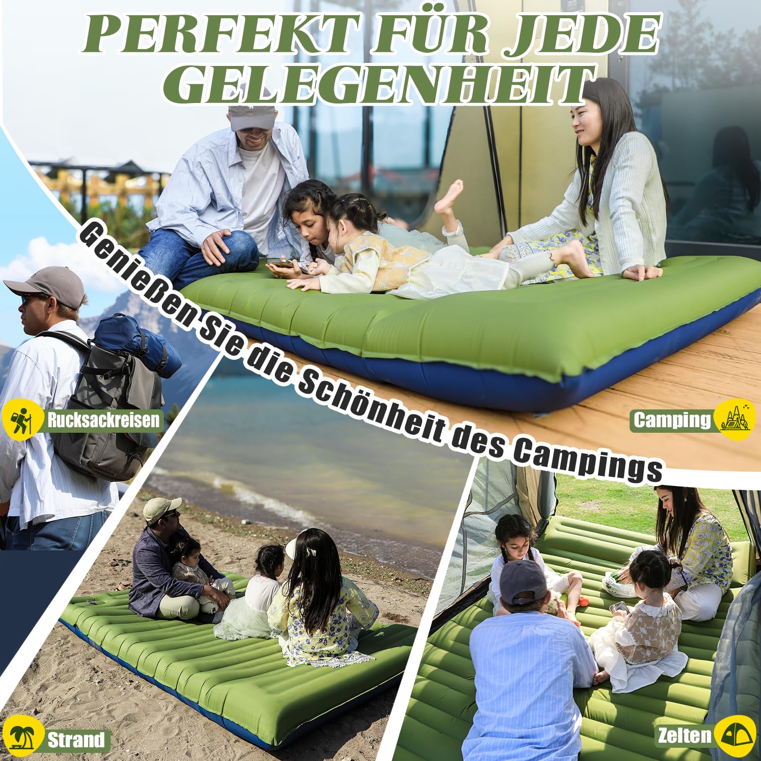["【Extra Wide 12CM Thick & Comfort】Myxslop camping mat for 2 people with the perfect dimensions of 196 x 145 x 12 cm provides you with ample support when inflated, offering a more comfortable experience by protecting you from cold and rough ground, whether you sleep on your back or side, ensuring a restful sleep anywhere!","【Quick Inflation & Deflation】Camping bed inflates in 30-60 seconds with built-in foot pump, no need for tedious mouth or hand pumping, quick deflation in 1 second. Enhanced double valve system and reinforced seam construction with leak-proof safety feature ensures no air loss.","【Durable & Better Loading】2 person camping mattress is made of 50D nylon and TPU composite material, puncture-resistant, tear-resistant, stable, and easy to clean, maximum load weight: 1100 lbs. Never worry about damage (Note: Load capacity is based on this value). Self-inflating mattress provides reliable protection even under challenging conditions and is a perfect fit for tents, sleeping bags, and camping cots.","【Ultra-Light & Portable】With a weight of only 5.0 lbs, our ultra-light camping mat can be folded into a compact bag of 7 * 7 * 11 inches and with the built-in pillow, eliminating the need for an extra pillow. The included carrying bag allows for easy transport in a backpack or trunk, perfect for camping, hiking, trekking, tents, or spontaneous trips.","【Versatile Use】Self-inflating mat for indoor & outdoor - Whether camping, beach vacation, garden party, or guest bed - this mat is versatile. The sturdy yet comfortable surface provides a reliable base for any environment, ensuring a relaxed outdoor experience.","【Better Experience】Each of our inflatable double mats undergoes strict quality control before shipping. Plus, we offer customer service so you can rest easy. Experience the best camping moments with Myxslop!"]