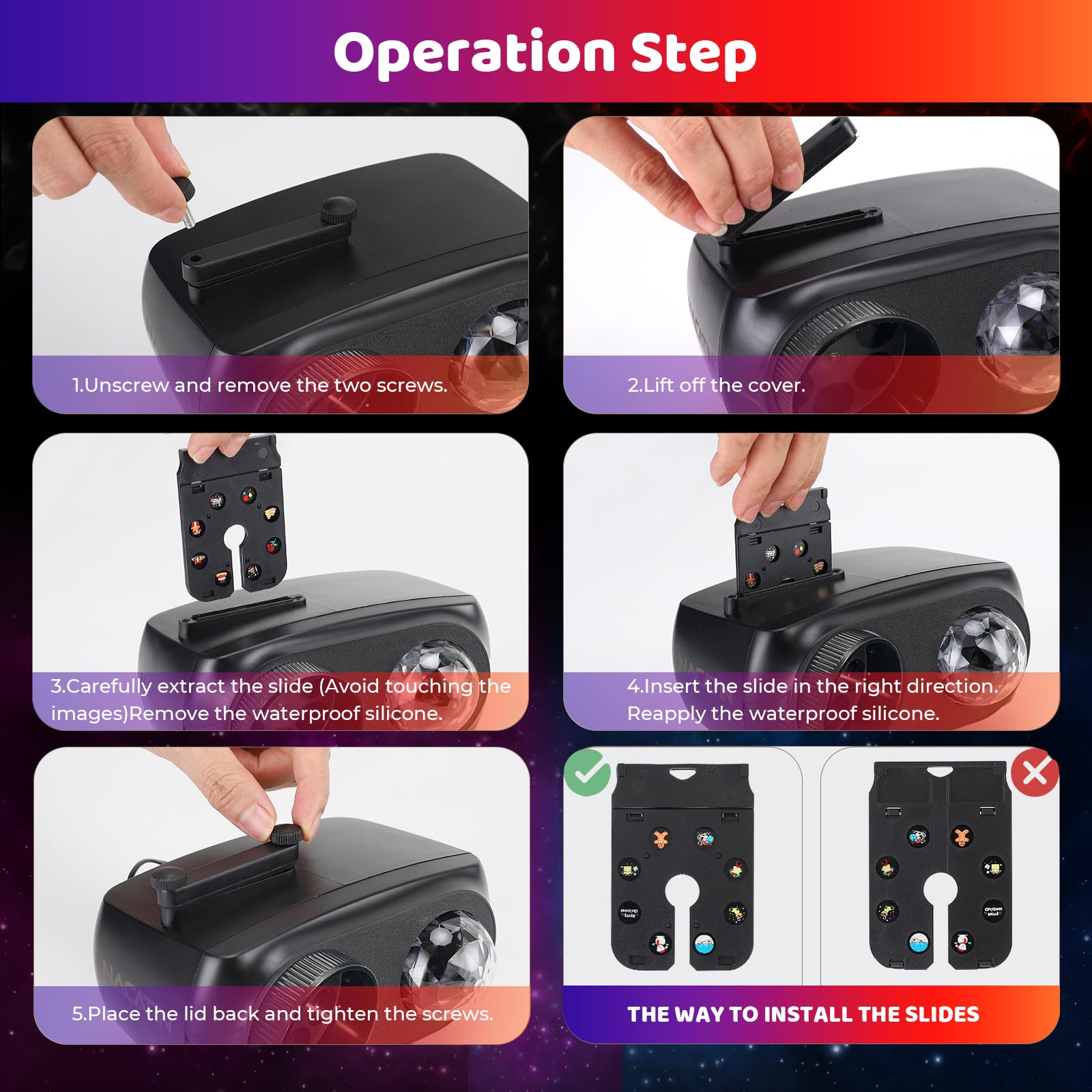 ["INTERCHANGEABLE SLIDES: Our projector combines vibrant patterns and 10 RGBW water wave effects, offering 12 slides with a total of 96 fun, holiday-related patterns. With 6 main themes including Christmas, Halloween, Birthday, New Year, Valentine's Day, and Easter, you can mix and match the effects for any occasion as you please. Easily create a magical atmosphere at your next party or festive event.",