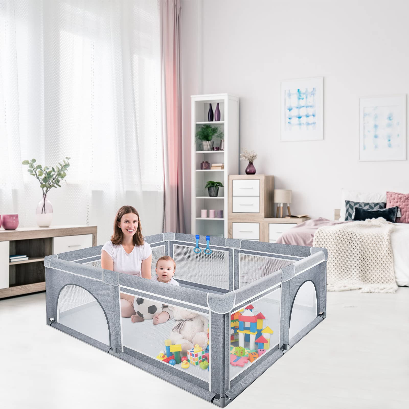 NAIZY Baby Playpen XXL Playard Gray Safety Gate with Non-Slip Base and Breathable Mesh for Children Indoors and Outdoors (200 * 180 * 68cm)