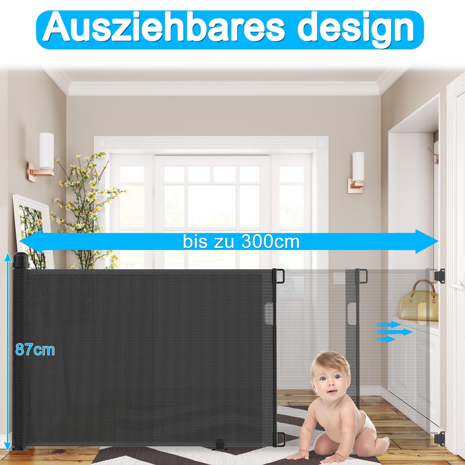 ["Expandable Baby Safety Gate - The maximum width of this baby stair gate can be extended to 118 inches and a height of 34 inches. This retractable dog gate is suitable for babies aged 6-24 months. For pets weighing 10 to 40 pounds.",
