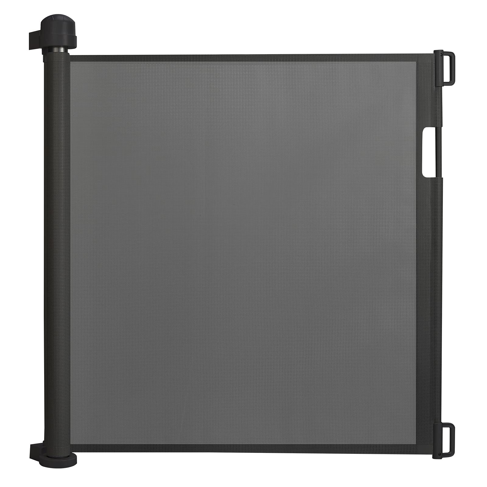 The overall appearance is black and rolled up approximately 34 inches long. The main size of the gate after pulling out is approximately 30.7 x 69 inches, and the total size of the fixed column is approximately 34 x 71 inches. The thickness of the base is approximately 0.8 inches and the entire body is raised.