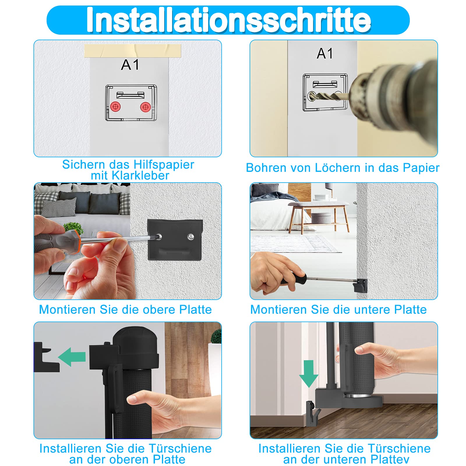 Ideal as a baby and pet gate, suitable for toddlers aged 6 to 24 months or pets weighing between 10 and 40 pounds. It can be installed indoors or outdoors, or on the door or staircase."]