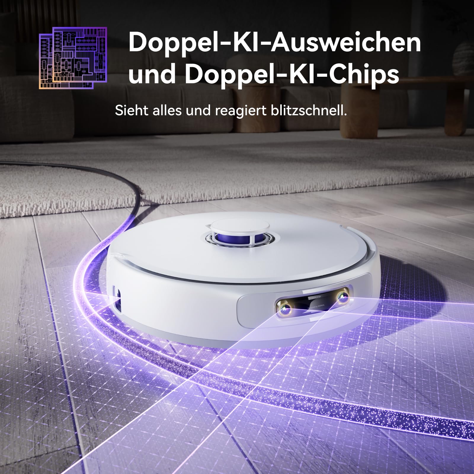 Real-time wet/dry separation system - Equipped with dual-chip AI, this vacuum robot with mopping function detects dirt in real-time and automatically activates the appropriate cleaning function. Detect dust on carpets? Mopping function pauses, suction mode activates. Spills on hard floors? Combined suction and mopping operation for maximum cleaning efficiency.