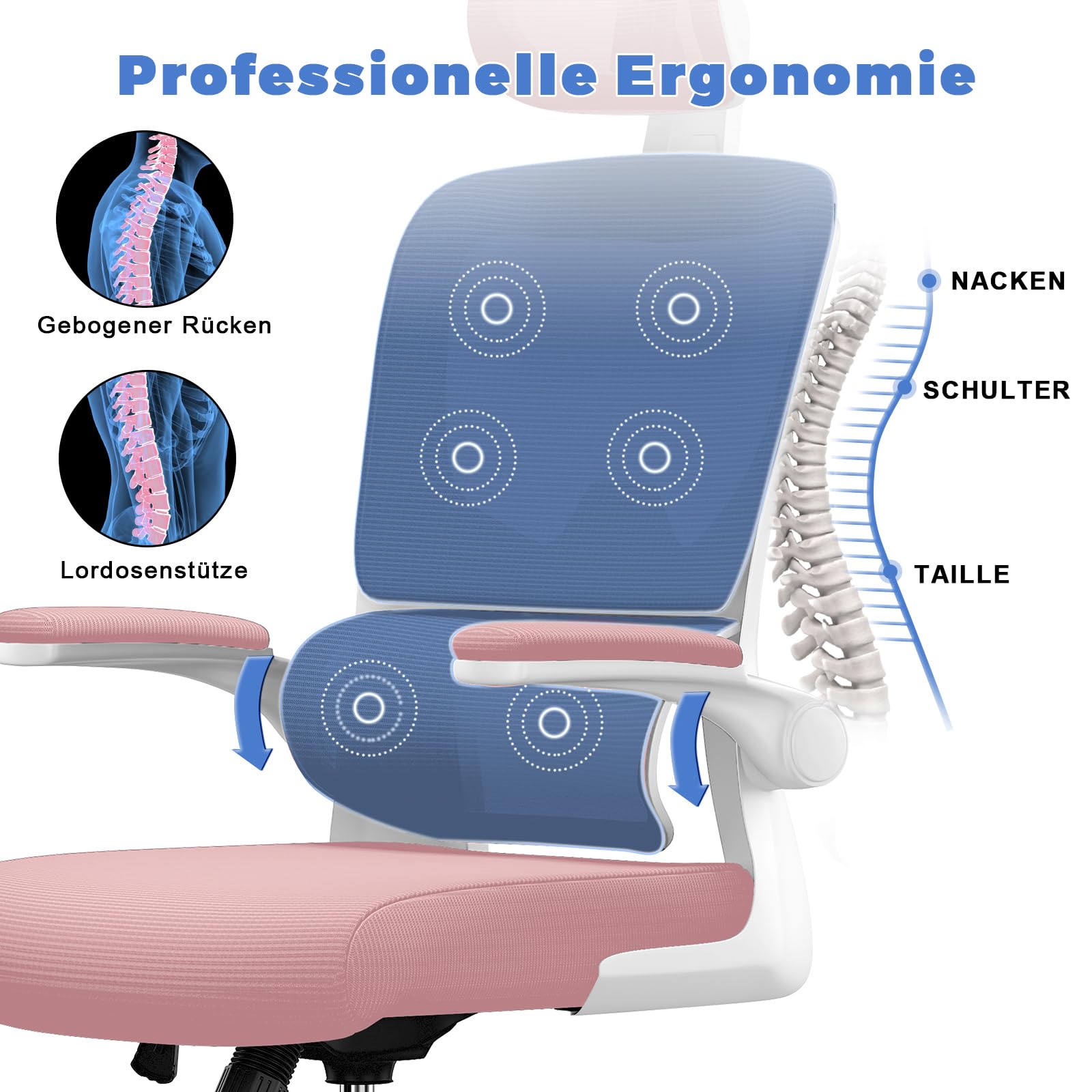 ["Prevent lumbar injuries"] Our ergonomic office chair features a new curved adaptive lumbar support that can automatically bend in a range of 0–20°, perfectly adapting to your lumbar curve and continuously supporting your lumbar area. It can relieve fatigue and effectively prevent lumbar injuries caused by sitting behavior.