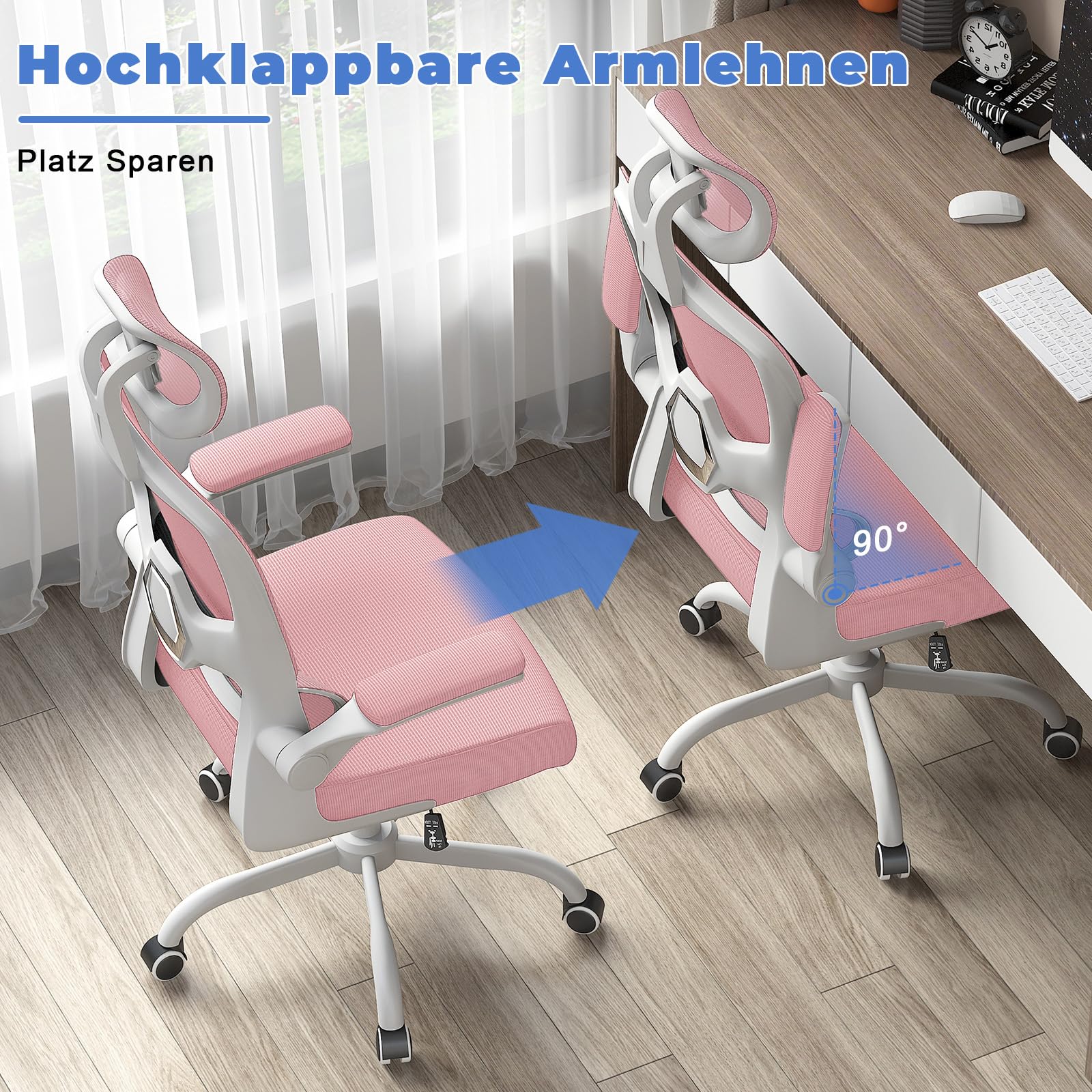 ["Space-saving"] The armrest can be freely rotated up and down. The padded armrests are perfect for supporting your elbows during work. If you don't need the chair, you can fold up the armrests and slide the chair under the table to save space.