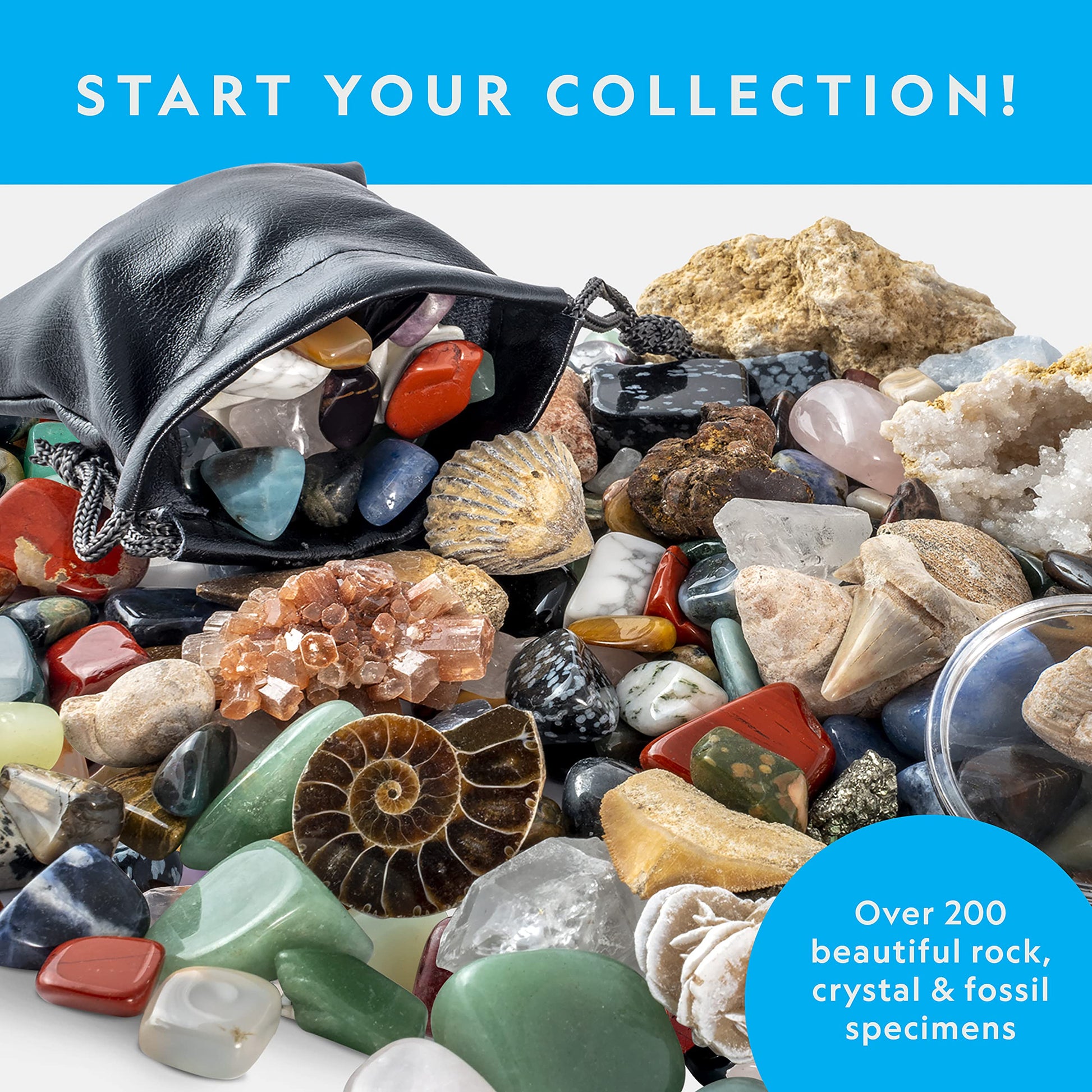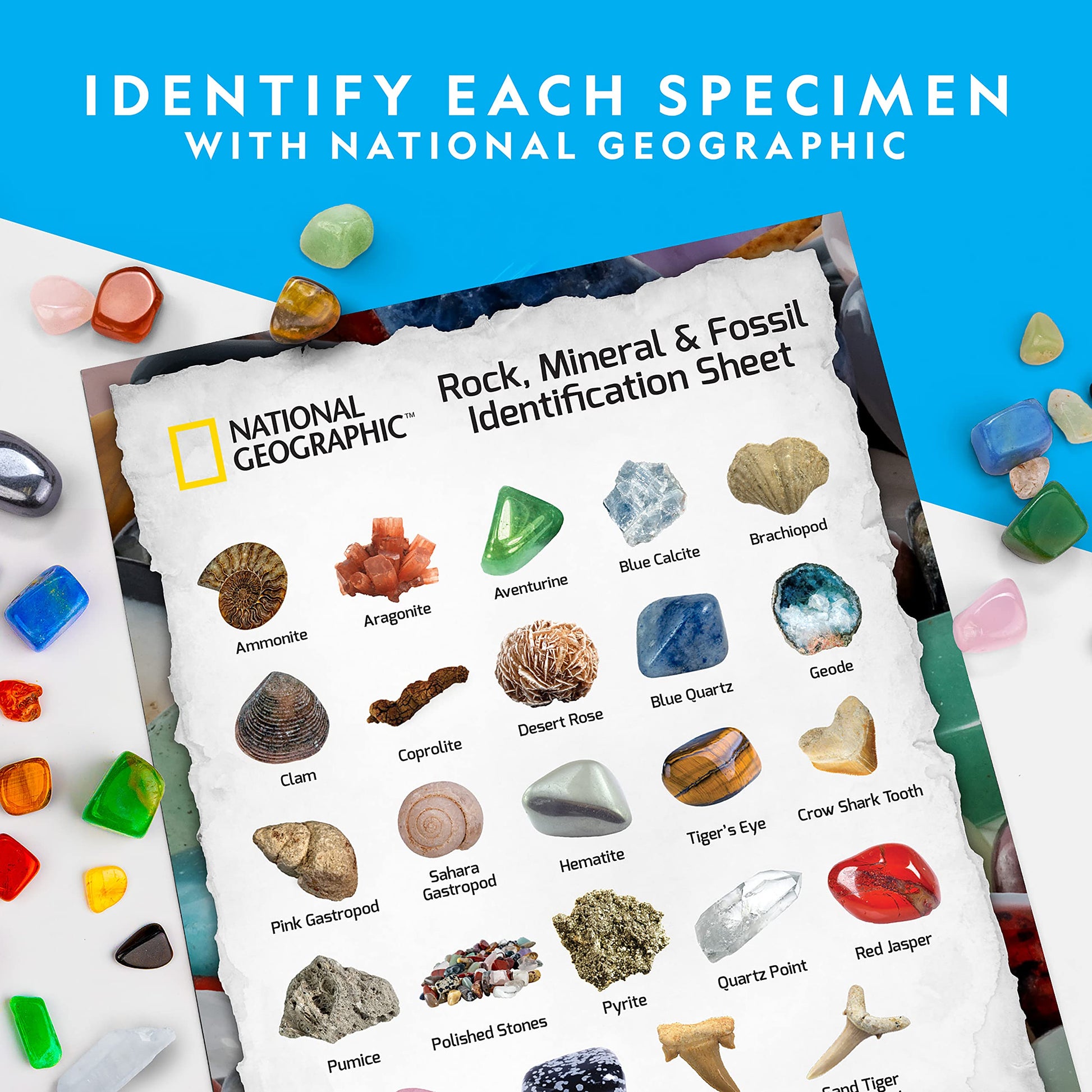 ["GEMSTONE KIDS - This gemstone set is a standalone semi-precious stone mix or the perfect addition to any children's stone collection. Included in the set are natural and polished samples of aventurine and rose quartz, as well as impressive hand pieces of snowflake obsidian, sand roses, red jasper, blue quartz, pumice, and even geodes.","REAL FOSSILS KIDS SET FOR FOSSIL COLLECTING - Real fossils including prehistoric shark teeth, snail shells, ammonites, shells, brachiopods, and much more. The research set includes a magnifying glass, a colored guide, and a identification sheet. This allows all stones, gemstones, mineral stones, and fossils in the kit to be sorted and identified.","REAL GEODES FOR BREAKING OPEN - There are true crystal treasures to discover; each kit contains one cracked geode and two uncracked geodes that can be broken open by oneself.","DISPLAY FAVORITE PIECES FROM THE STONE KIDS SET - The included mini display case can perfectly showcase the favorite pieces from the gemstone set, while the rest can be stored in the included bag.","HIGH-QUALITY DISCOVERY SET FOR KIDS - National Geographic Kids is proud to produce high-quality scientific toys, and with exceptional service. If you are ever unsatisfied, please contact us so we can make it right!"]