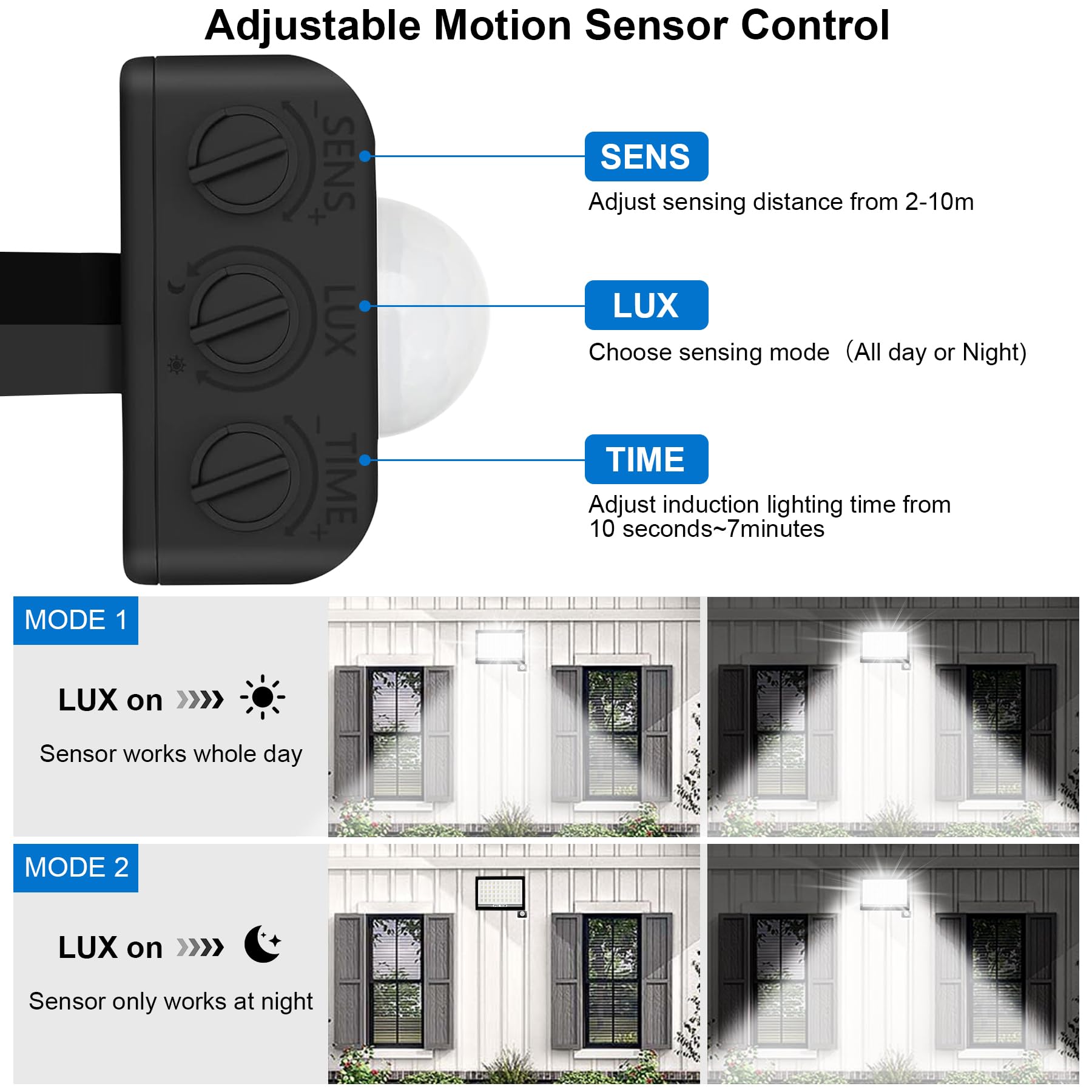 ["💡【Ultra-Brightness】NATPOW security lights with 200 premium SMD LED beads and brightness up to 11000 lumens light, 6000K daylight white offers soft and uniform light with anti-glare and no shadows. It provides a large field of light on our driveway, front door, garden, and more.","💡【Sensitive Motion Sensor】The PIR detector is quite sensitive. There are three setting switches, it is lighting time (TIME), motion distance (SENS), and day/night settings (LUX). Motion distance up to 10M, lighting time from 10 Sec to 7 Min. adjustable. Perfect security light for outdoor areas.","💡【IP66 Waterproof Floodlight】With IP66 waterproof and rustproof and surface treated with high-quality electrostatic adsorption, it is safe for the light to function properly in rain, snow, heat, or cold environment, providing stable and bright light for gardens, yards, villas, parks, garage, swimming pool, roofs, buildings, streets, roads, etc.","💡【Easy Installation & 180° Adjustable Angle】Our outdoor security light comes with 1.5 meters of cable, you could install it on the ground, on the wall, or on the ceiling with screws. 180° Adjustable bracket, you can adjust it at any angle you want.","💡【Upgrate Heat Dissipation】The design of the aluminum die-cast housing, efficient cooling structure, and high-temperature glass make this outdoor LED security lighting more durable and reliable. It can protect this LED floodlight from the impact of extreme weather."]