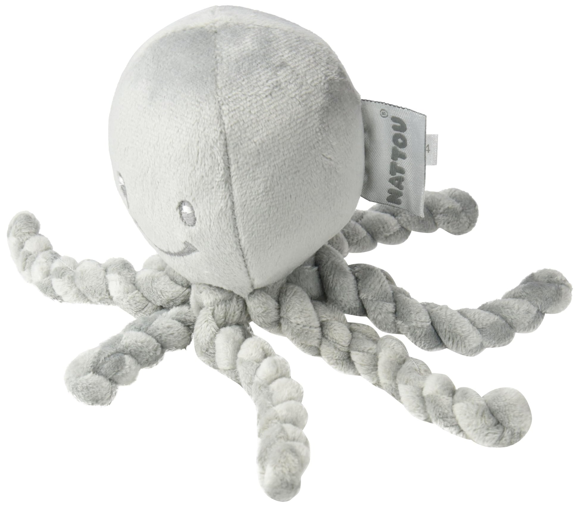 ["Cute octopus as a cuddly toy for newborns and premature babies, ideal for soothing the little ones thanks to the similarity of tentacles and umbilical cord", "Innovative cuddly toy: Designed to promote natural grasping reflex of newborns with umbilical cord-like tentacles for grasping", "Brand quality: Very soft material made of 100% polyester, cuddly and snugly, optimal size for babies: 9 inches", "Easy to clean: Machine wash at 30 °C", "Scope of delivery: 1 x Nattou cuddly toy octopus, collection: Lapidou, material: 100% polyester, dimensions: 9 x 3 x 3 inches, color: Gray, 877558"]