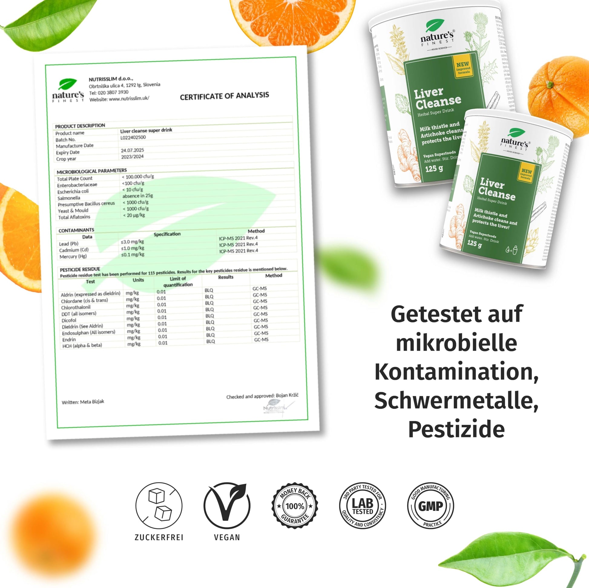 ["๐ SUPPORT FOR YOUR LIVER WITH MILK THISTLE - Your liver works around the clock for you. Our Liver Complex combines milk thistle, known for its content of silymarin, with artichoke extract, turmeric, and ginger - for a gentle detox regimen that supports your body and gives you a light, balanced feeling.","๐ NATURAL DETOX REGIMEN WITH ARTICHOKE - Artichokes are a natural source of cynarin, which promotes digestion and supports an effective liver detox. This leaves you feeling refreshed and ready for the day.","โจ CARE FOR YOUR LIVER HEALTH - The plant compounds included, such as silymarin from milk thistle, support natural detoxification and contribute to caring for your liver - ideal for a conscious diet and well-being.","๐ EASY AND DELICIOUS IN DAILY LIFE - Treat your liver regimen to a moment of refreshment: Mix a teaspoon of the orange-flavored powder in a glass of water. This allows you to effortlessly integrate your detox regimen into your daily routine.","๐ HIGH-QUALITY, VEGAN, AND SUSTAINABLE - Our Liver Complex is made from carefully selected, natural ingredients. Vegan-friendly, without artificial additives, and perfect for a conscious diet - for a good feeling and support in caring for your liver."]