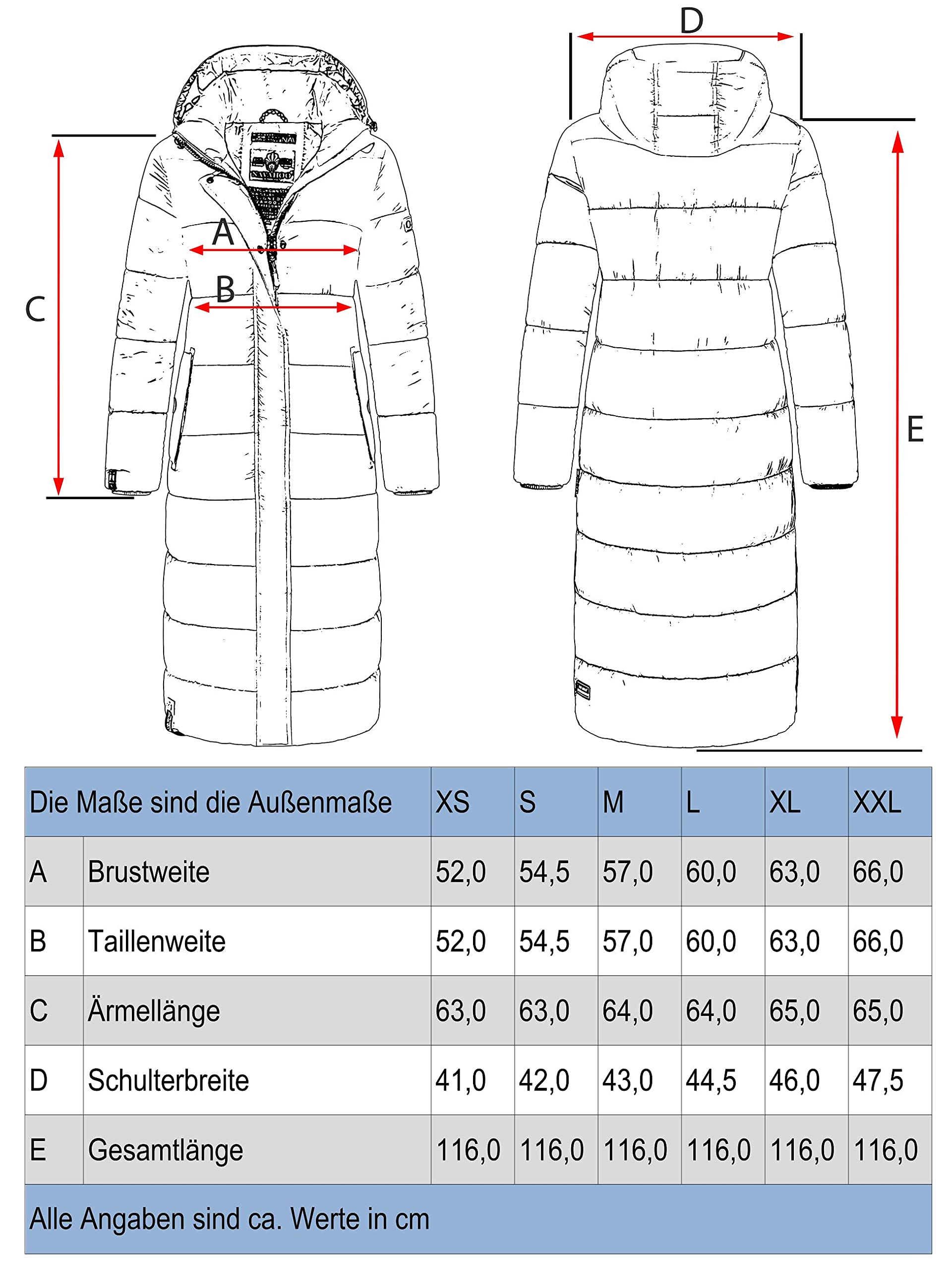 ["LOOK: Stylish women's quilted coat for winter with practical, detachable hood and inner pocket for Bluetooth headphones and power bank (not included!) - the perfect companion in winter and autumn!", "MATERIAL: Chic long winter jacket with matt shimmering outer material, the inner lining is super soft and inviting to cuddle up in", "FIT: The lined coat with a great length up to approximately mid-calf keeps wonderfully warm even in cold weather and scores with a modern oversized look", "DETAILS: Wide ribbed cuffs on the sleeves and lined pockets against cold hands are perfect for winter, thanks to the inner pocket for wireless headphones and power bank (not included!), the handbag can stay at home!", "The warmly quilted winter coat with detachable hood can be combined with any style and should now be a must-have in every wardrobe!"]