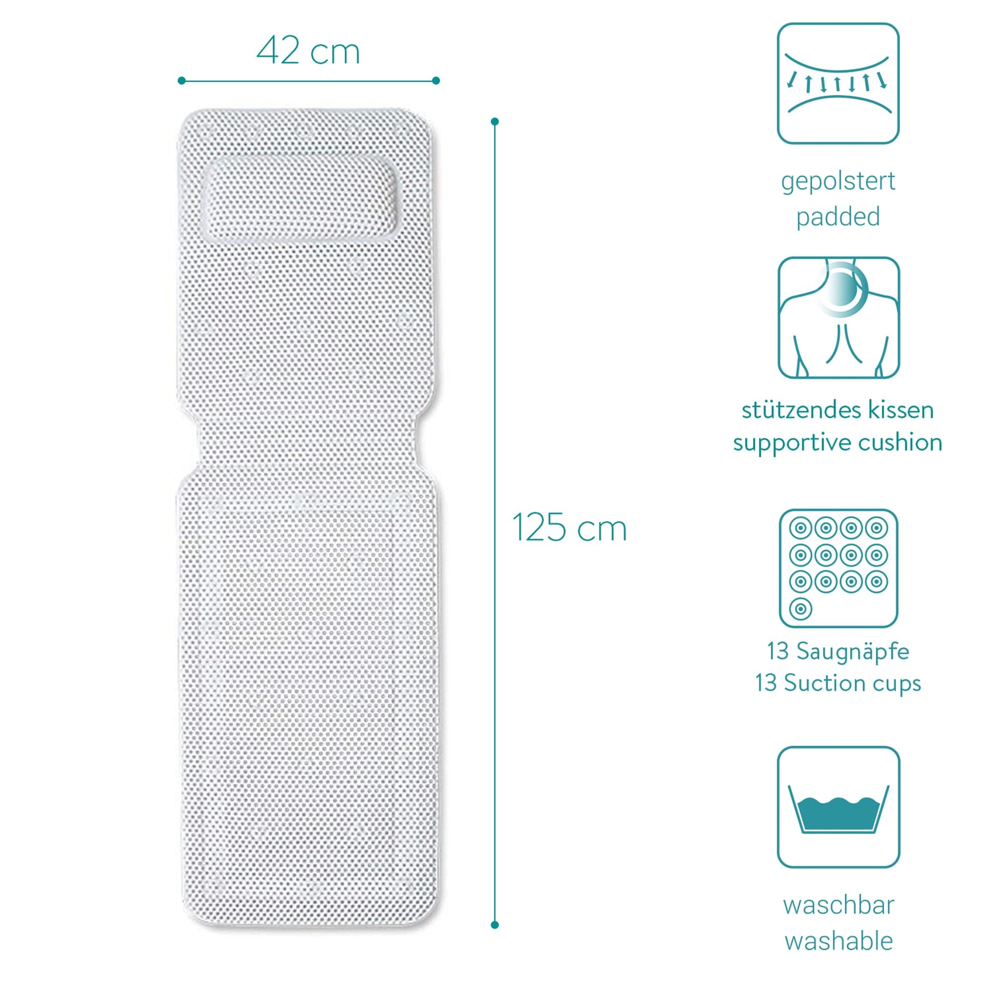 Navaris bathtub full body mat with pillow - 125x42cm mattress for bathtub tub pillow bathtub insert soft - mesh mat in white