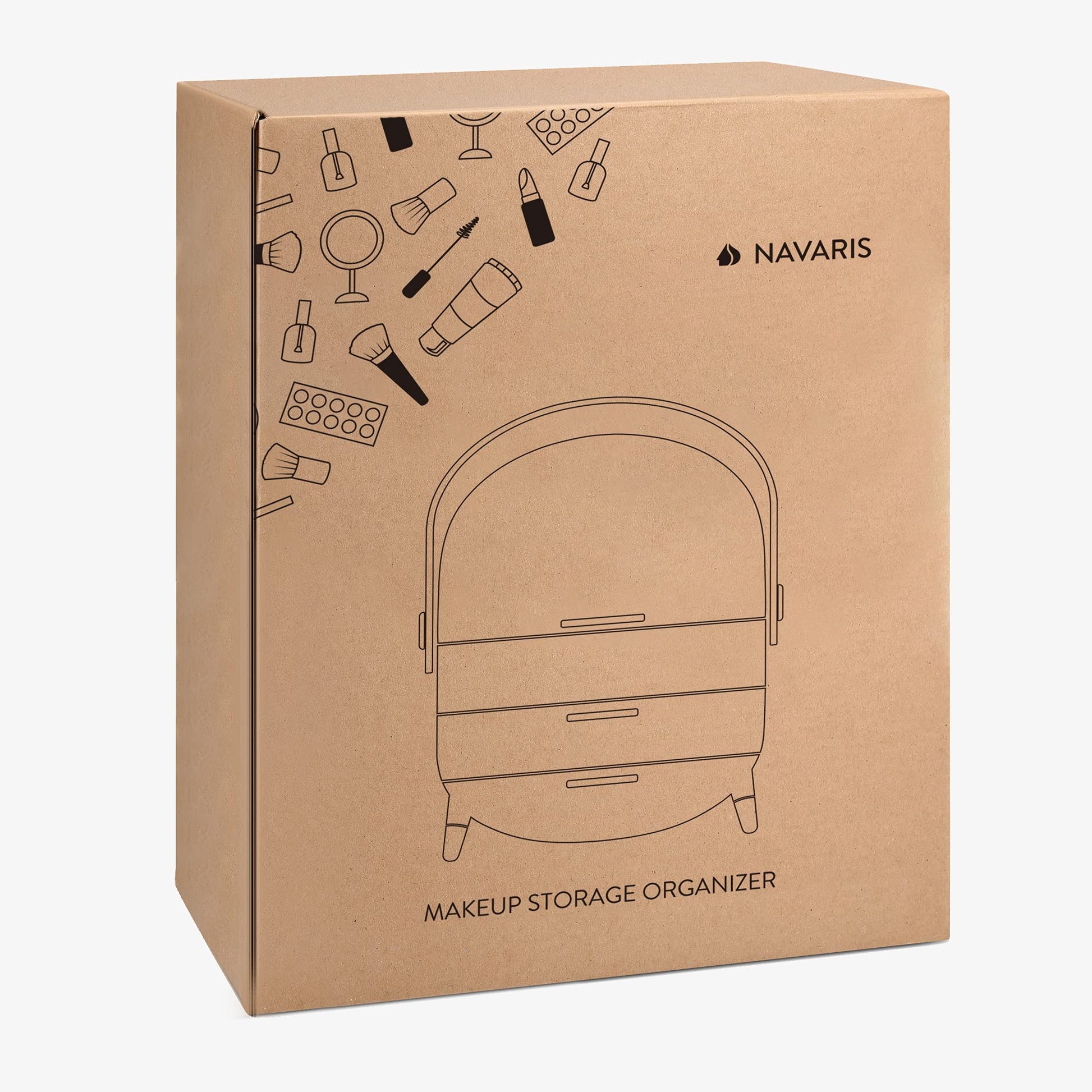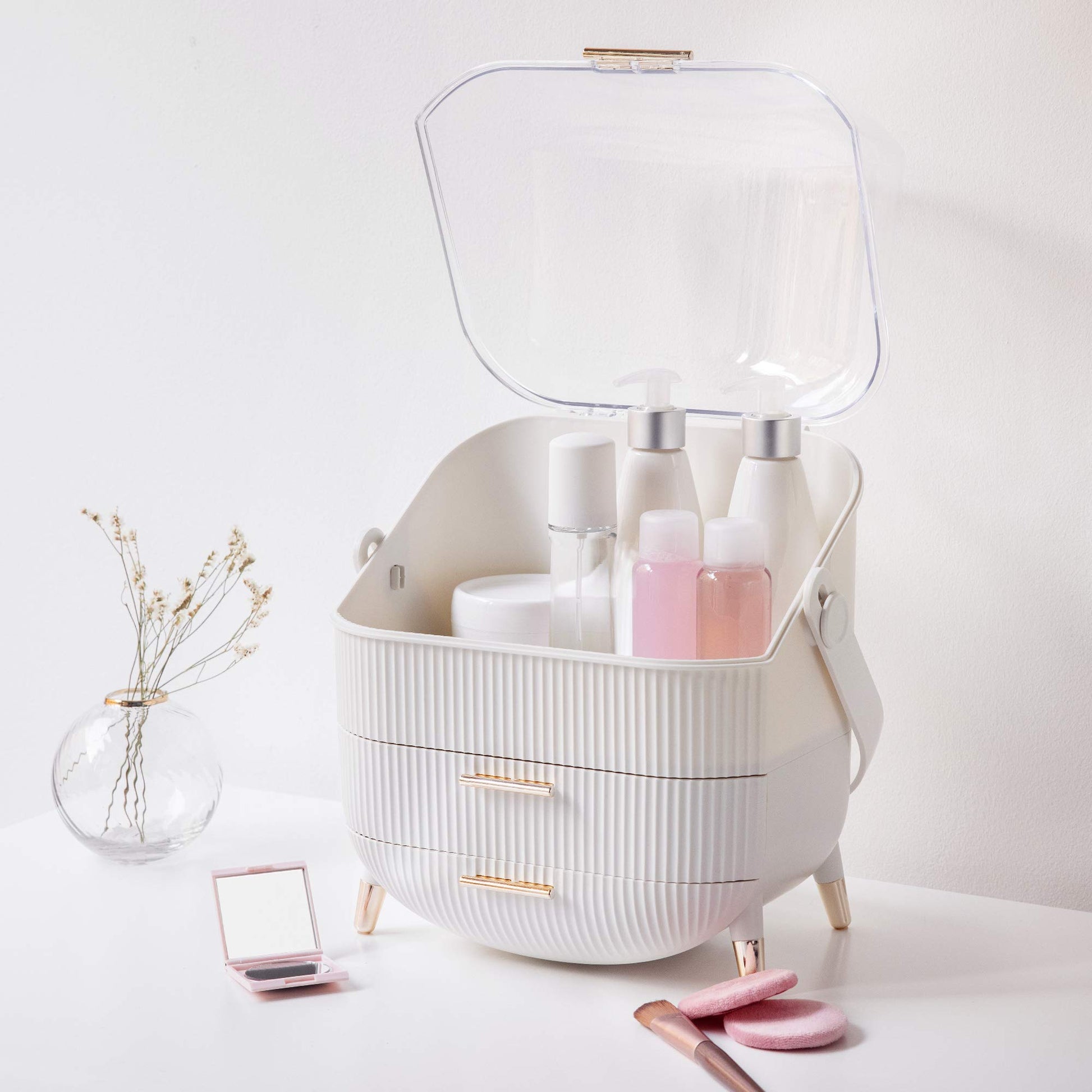 ["VINTAGE: This stylish box with a transparent dome in vintage design by Navaris allows you to always keep track of your makeup. Additionally, the white-transparent color combination adds a unique touch.","KEEPING ORGANIZED: With smart compartments and spacious drawers, you have enough space for all your beauty products. You'll never have trouble finding what you need again.","DETAILS: 1x Makeup Organizer / Dimensions: 29 x 20 x 34 cm / Weight: 1.14 kg / Material: Plastic","VERSATILE: With the organizer, you can store not only your makeup but also other items like pens, kitchen utensils, or spices. Therefore, the storage is also perfect for your desk or kitchen.","TRAVEL-FRIENDLY: Makeup case to go! The portable handle on the case lets you take your makeup essentials with you wherever you go. Everything stays dry - the storage is waterproof."]