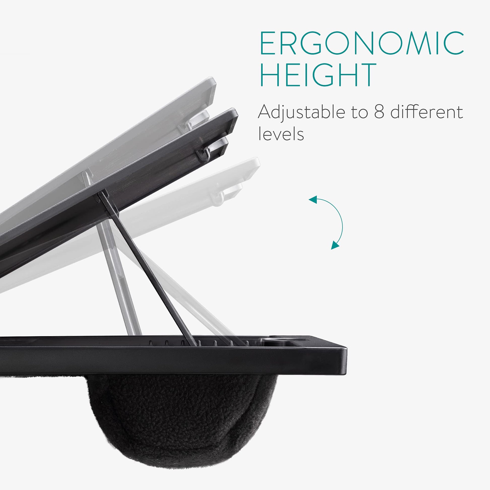 ["Multifunctional: Use the laptop table as a work desk, writing desk, drawing stand, or tray in bed or on the sofa. Thanks to the integrated cushion, you can comfortably place your notebook on your lap.","Ergonomic: With 8 different levels, you can adjust the laptop to your liking for comfortable work.","Product details: 1x laptop pad / Material: plastic, Polar Fleece / Dimensions: 37.6 x 28 x 5.8 cm / Weight: 855 g / Color: Black","Easy to transport: Simply fold the stand together. This way, you can take it with you on trips or to work.","Easy Cleaning: The cushion stand is made of plastic and soft fabric. It can be easily wiped down with a damp cloth if needed."]