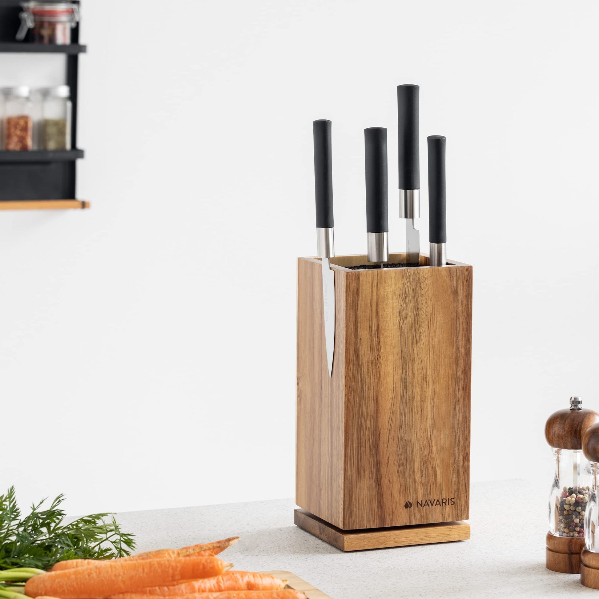 Navaris rotating magnetic knife block made of acacia wood with bristle insert - wooden knife block without knives for kitchen knives, chef's knives, and cooking utensils.