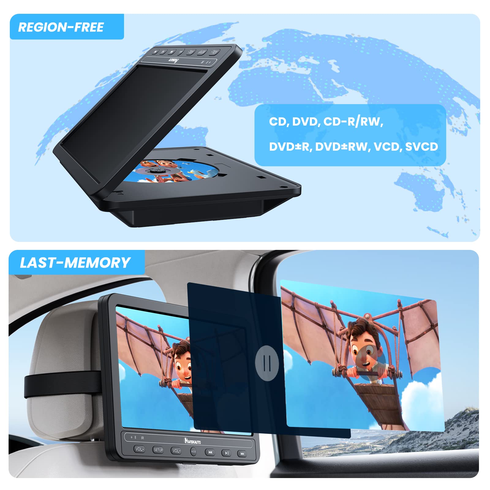NAVISKAUTO 10.5'' Car DVD Player with 2 Screens, 2 Headphones, 5 Hour Battery, Car DVD Player with 2 Monitors, Headrest TV for Kids, Last Memory, USB, AV In/Out, 12V.