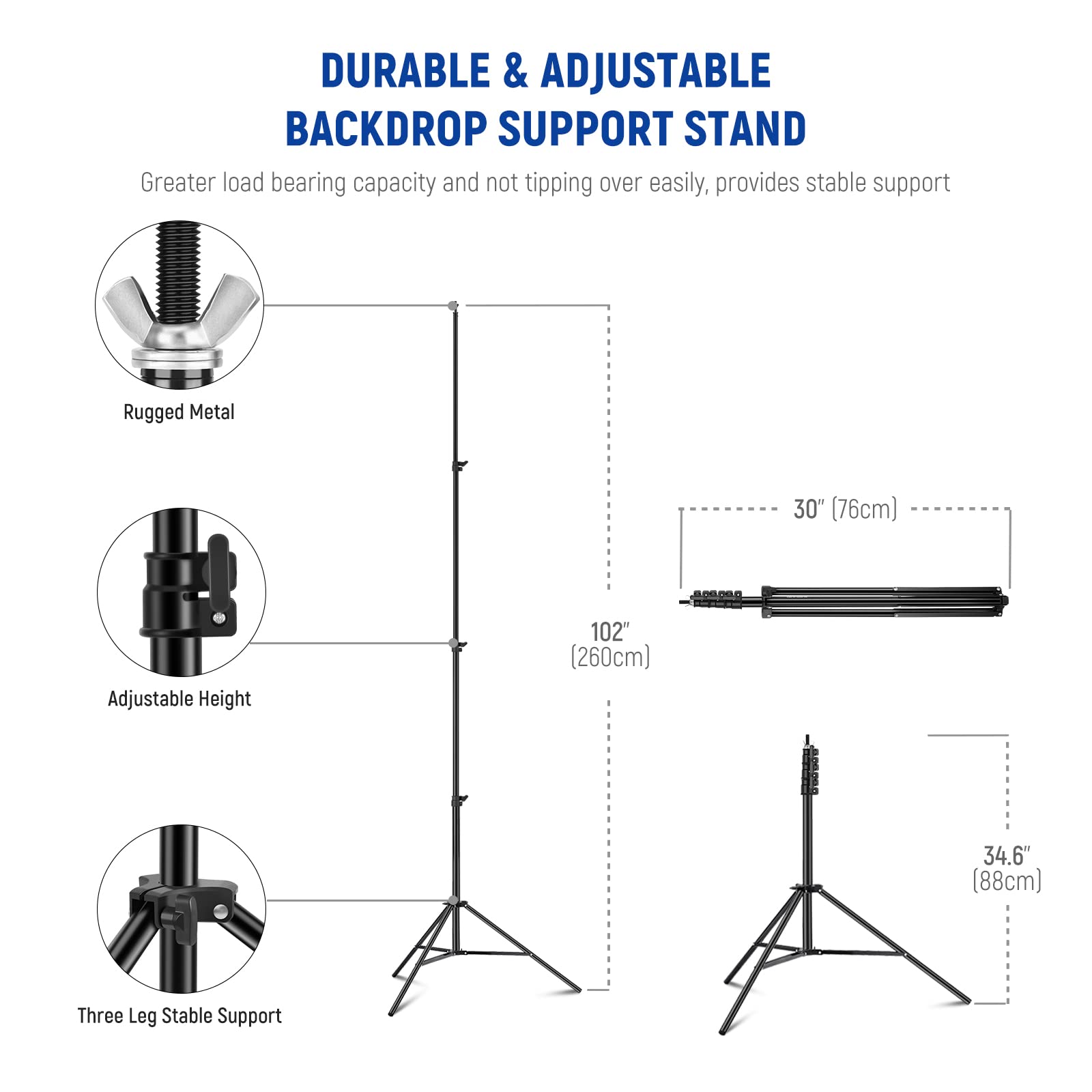 ["【8.5x10ft versatile backdrop stand】The backdrop stand system includes 2 telescopic stands, which extend up to 8.5ft high, and 4 crossbars, which extend up to 10ft high when all connected. The multifunctional pipe and drape style support stand system is ideal for professional studio photography, home photo studio, filmmaking, parties, family gatherings, weddings, and stage backdrops for other festive events","【Strong support with high-quality construction】This photo studio backdrop stand set is made of aluminum alloy and provides strong support for muslin backdrops, green screens, canvas, paper backdrops, and other decorative items. The maximum load capacity reaches 11lb/5kg. Two empty sandbags are included to stabilize the backdrops if needed. (Note: Sandbags are delivered empty)","【Easy assembly】The backdrop stand kit is easy to assemble and disassemble with foldable telescopic backdrop stands and connectable crossbars. After unfolding the backdrop stands, you can extend the stand's height from 2.9ft/88cm to 8.5ft/2.6m. The length of the horizontal bars can be easily adjusted by connecting 1, 2, 3, or 4 sections of the crossbars together, making them suitable for backdrops of different sizes","【Clamps and clips included to hold and stretch】6 spring clamps are included to securely attach backdrops to the stand and prevent slipping. An additional 6 clips can be attached to the stand with strings to clip the backdrop, fully stretching it and preventing wrinkles","【Complete backdrop stand system】This backdrop stand set includes 2 backdrop stands, 4 crossbars, 6 spring clamps, 6 backdrop clips, 2 sandbags, and 1 carrying bag"]