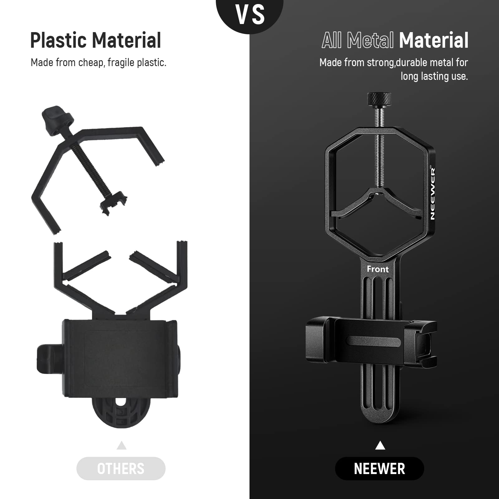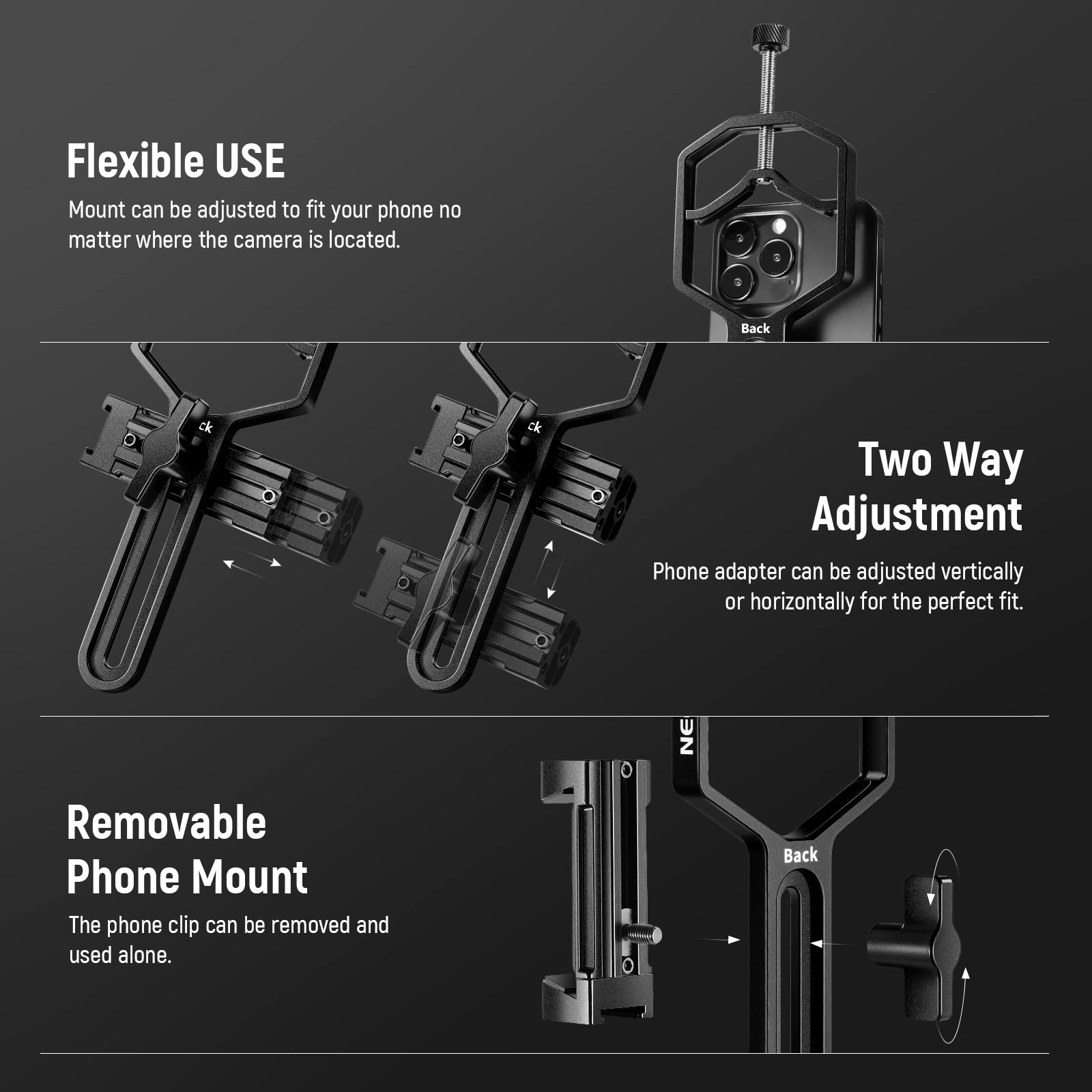 ["Telescope Phone Holder】 This NEEWER phone holder fits your telescope with an eyepiece outer diameter from 1.18"/30mm to 2.52"/64mm","【Perfect for astrophotography】 Connect your mobile phone to a telescope and capture photos and videos through the eyepiece. Easily take pictures of celestial bodies with your phone","【Universal compatibility】 With a width adjustment range from 2.09"/53mm to 3.54"/90mm, the adjustable phone holder is compatible with iPhone Samsung Sony and more","【Adjustable phone holder】 Release the locking button of the phone holder to adjust the position based on your phone camera and size. This holder makes it easy to center your phone camera over the eyepiece","【Full metal design】 Made of strong, durable metal for longevity"]