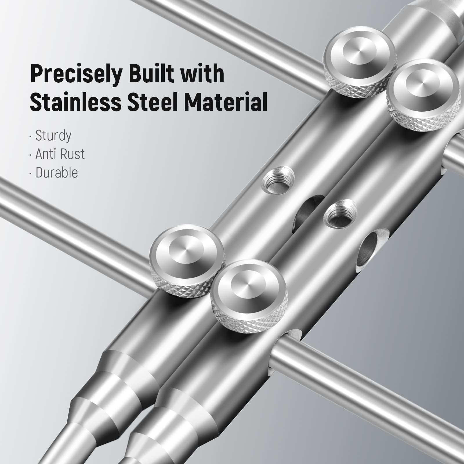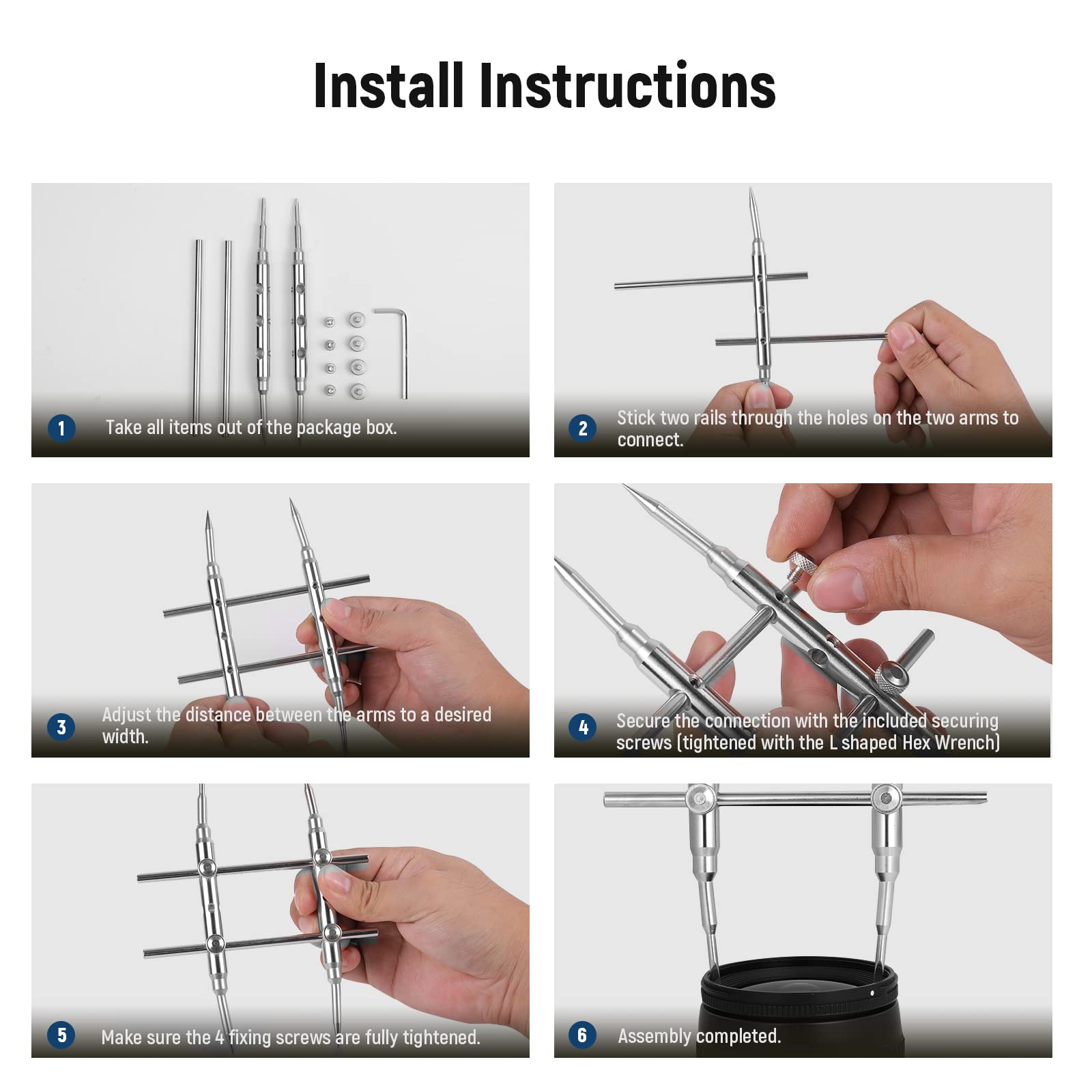 ["Design with four screw locks","With pointed and flat tips","Fits grip rings of telescopic camera lenses and optical lenses","Adjustable opening up to 110mm (4.3\")","Made of high-quality, non-magnetic stainless steel"]