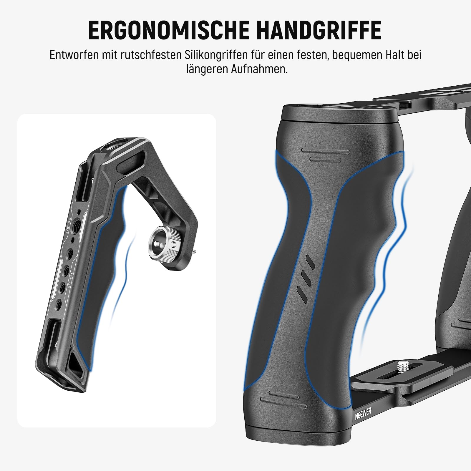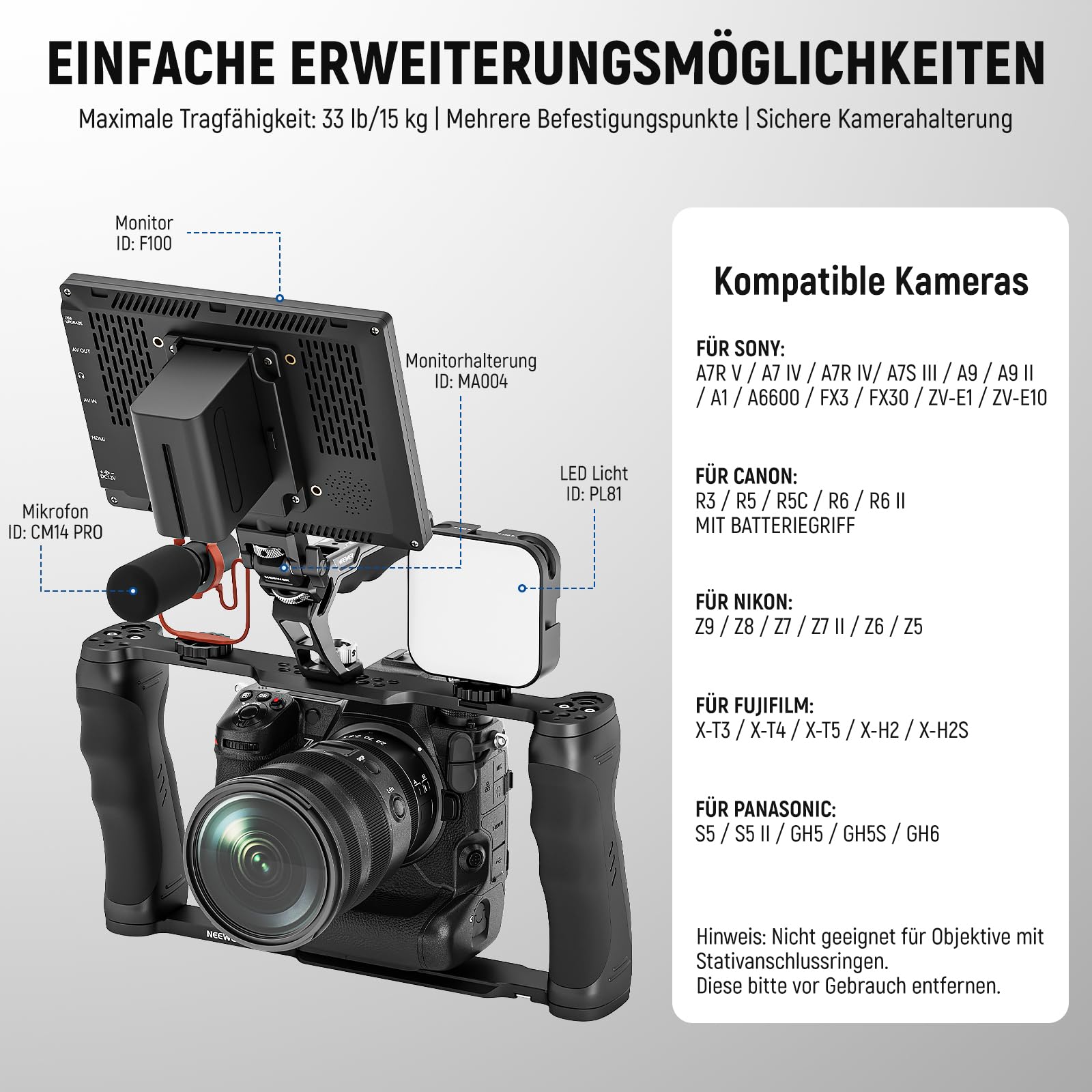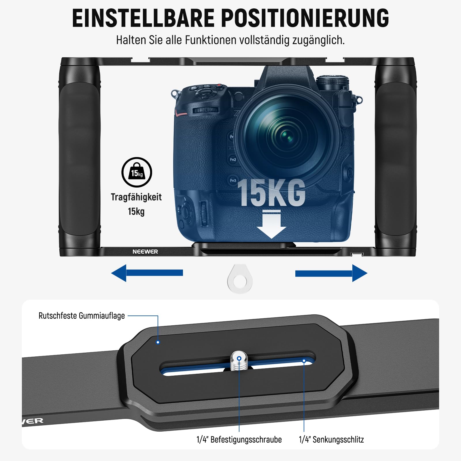 ["Universal Camera Cage Rig】 Compatible with Sony a7C ZV-E1 ZV-E10 ZV-1 ZV-1F a7iv a7s III a7R V a9 II rx100 vi a5000 a6400 a6700 6600 Canon R50 R10 R7 R6 mark ii R5C R5 R3 90D EOS R8 Nikon Zfc Z9 Z8 Z7 Z7II Z6 Z6II Z30 Fujifilm X-20S X-T4 X-T5 Compatible with Panasonic gh6 lumix s5 s5iix Blackmagic 4K 6K bmpcc 6k pro and other DSLR cameras. Note: This camera cage is not suitable for use with a lens with tripod collar mounting ring. Please remove it before use","【Top Handle with Silicone Grip】 The included top camera handle NEEWER CA007 with a 3/8\" ARRI rosette screw can be securely attached to the camera cage, providing stable handheld video recording experience with its contoured silicone grip. It also features 4x 1/4\" mounting threads, 2x 3/8\" ARRI locating holes, and 3x accessory shoe mounts for monitor mounts, magic arms, LED lights, microphones, and more","【Secure Camera Mounting】 A 1/4\" screw and slot on cage base allow secure and flexible camera installation. Magnetically stored flathead screwdriver for easy tension adjustment, non-slip silicone pad for stability and protection. Multiple 1/4\" threads, accessory shoe mounts, and 3/8\" ARRI locating holes can equip your rig with additional devices like magic arms, microphones, ball head adapters, and LED video lights","【Dual Handles and Tripod Mounting】 The two ergonomic hand grips with faux leather texture and finger grooves provide comfortable and secure grip on the cage. Or mount it via the 1/4\" screw holes on the bottom to a tripod head, seamlessly switching between handheld and tripod shots thanks to the arca base","【Solid and Lightweight Construction】 Precision CNC machining and lightweight aluminum handle and cage ensure accurate alignment and full access to the vlogging camera. The top handle weighs 145g and can support up to 10kg, while the cage weighs 650g and can accommodate equipment up to 15kg. The black anodized surface ensures durability when used outdoors"]
