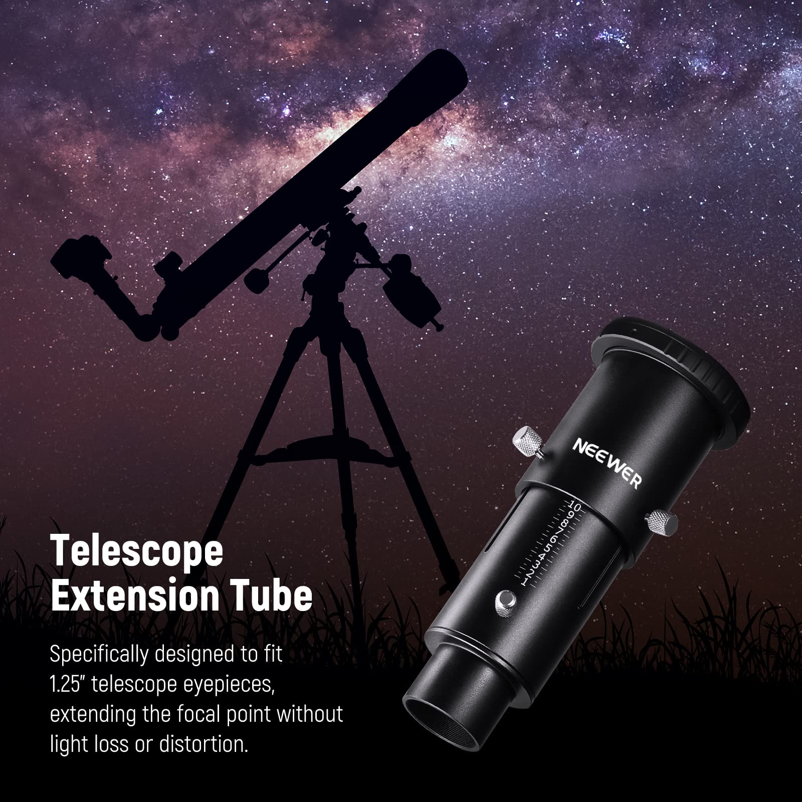 NEEWER Variable 1.25" Telescope Camera Adapter and 1.25" Extension Tube Set, compatible with Nikon DSLR cameras and telescope eyepiece for prime focus and eyepiece projection astrophotography.