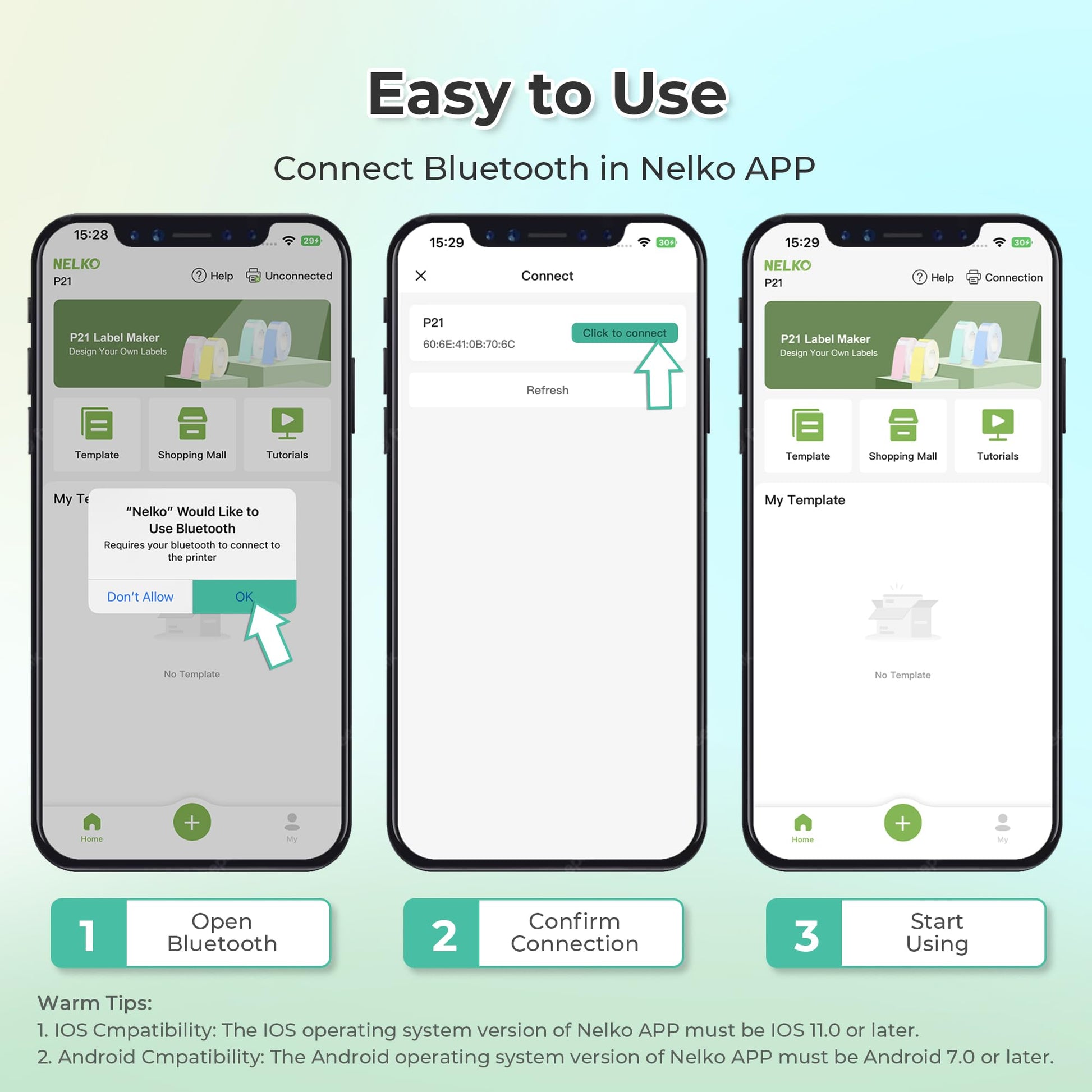 ["In comparison to traditional label printers, our products are half as heavy and large, smaller, smarter, and more convenient for users. The wireless Bluetooth label printer can be easily carried in a pocket and allows for printing anytime, anywhere. For better print quality, we recommend using our NELKO thermal label paper. For P21 Nelko APP iOS users, Nelko iOS V2.7.0 prints multiple copies abnormally, please update Nelko APP to the latest version V2.7.1", "High-Quality Printing: Label printer with BPA-free thermal direct technology. Equipped with high-speed chips and 203 DPI, allowing you to enjoy high-definition printing without relying on ink or toner. The label printer comes with a durable, rechargeable battery and can work for long periods of time. This label printer is a black and white printer that only prints black text. We can create color label artworks and need to use color sample label tapes for printing. Note: Charging adapter not included", "Easy to use: NELKO label printer compatible with iOS and Android smartphones via Bluetooth connection. Step 1: Download the "Nelko" APP from Google Play or the App Store. Step 2: Install the paper roll. Step 3: Connect the P21 to the APP via Bluetooth. Step 4: Select a quick template and start printing. This label printer with the band APP contains over 90 fonts, 10+ languages, and 450+ materials. Note: This label printer does not work with computers", "Multiple creative functions & templates: This label maker app offers various functions and templates, allowing you to easily create different design label stickers from the app with text, QR code, barcode, materials, images, time, and borders, etc. The length of the labels is fixed, including 12X40mm, 15X30mm, 15x40mm, and more. Note: Continuous label tapes are not supported", "Design your own labels: The label machine with tape is commonly used in private life and office. For home use to organize your clothing, food storage, cosmetics, and mail. For office use, office organization like notebook labels, price tags, and reminder tags. For school use to identify personal items, name tags. Label printers provide you with fun and convenience"]