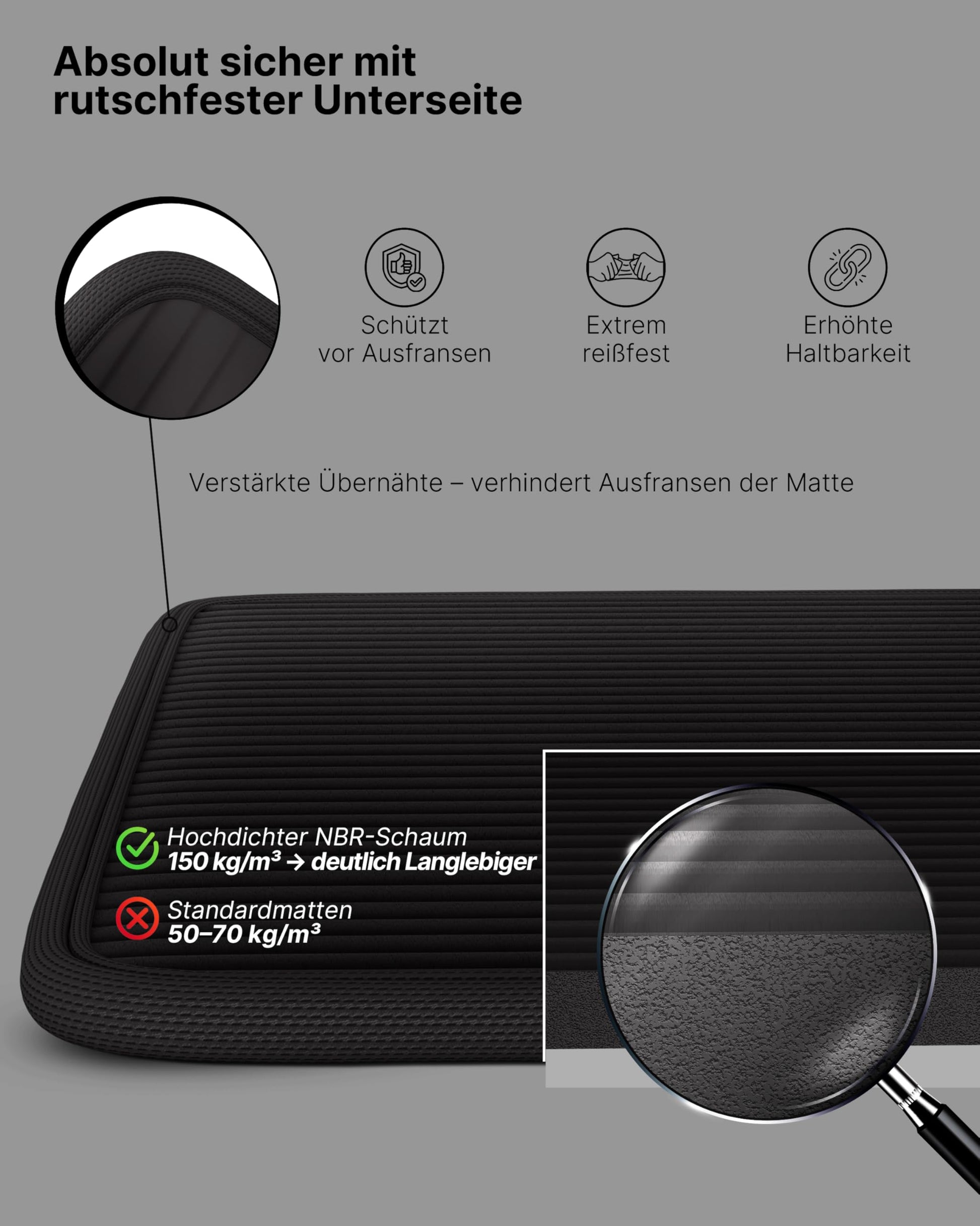 "The NEOLYMP fitness mat is extra thick, durable, and resilient with a density of 150 kg/m3. The joint-friendly material has a soft surface and is comfortable on the skin. Thanks to the ribbed underside, the training mat is particularly non-slip and provides maximum grip.
