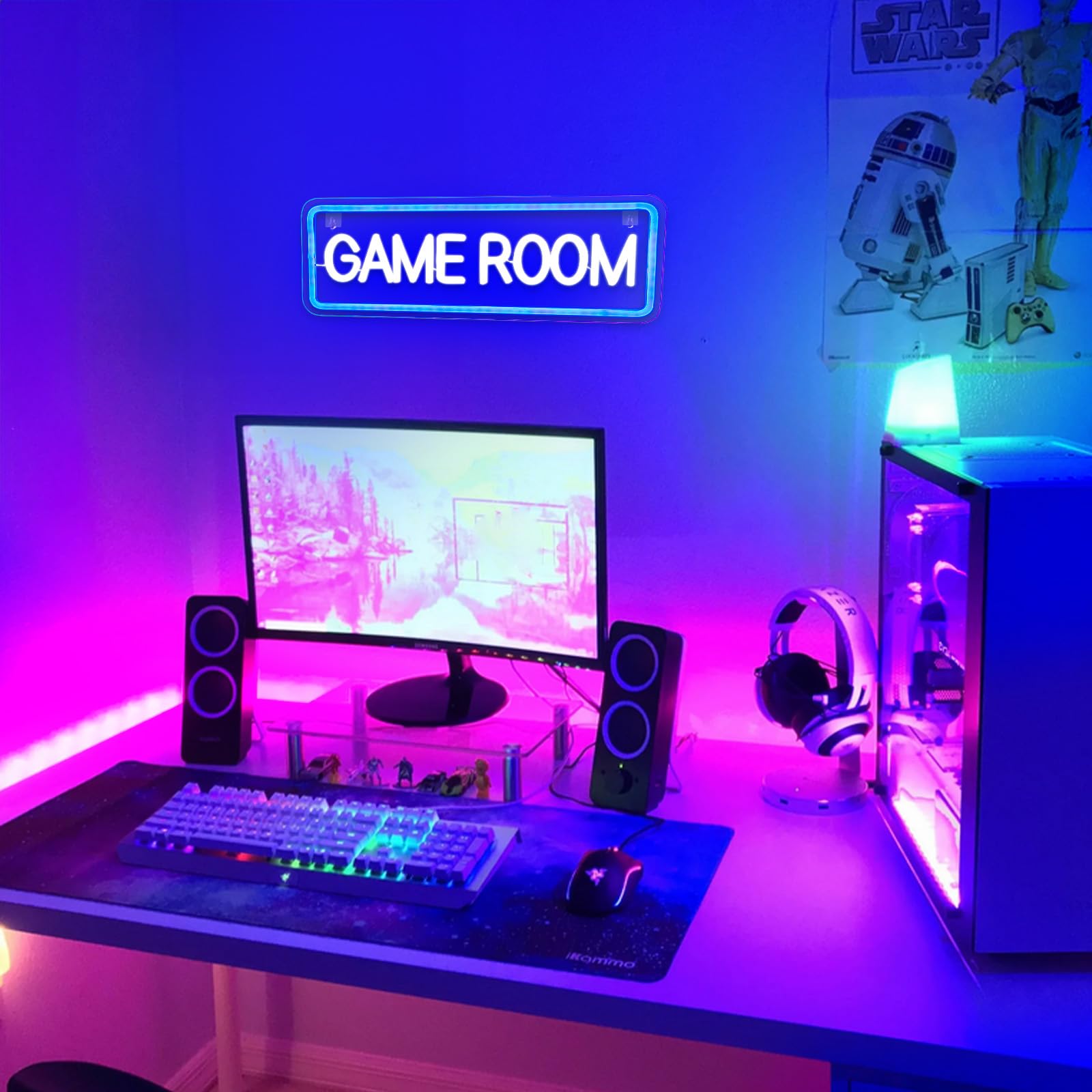 ["Original Design Gaming Neon Sign We all like to play games with friends! Our neon light design as the letters GAME ROOM, blue and white light and vibrant colors can illuminate a dark, dreary space, making your game room more attractive and adding more fun and gaming experience, perfect for decorating a boy's room or game room","Acrylic backboard large. The size of the Gaming Neon Sign is about 15.7" in length, 5.9" in width, (40*15cm) Compared to other ordinary neon lights, the visual effect is better and more obvious. Equipped with a transparent acrylic backboard, making the bright colors vibrant and clear, with strong light transmittance, absolutely amazing decorations for arcade space, game room decor, or children's room","USB powered with On/Off switch. The light of the tube is gentle and non-glare, tubes are touchable even when on and do not get hot, safe for kids. Just connect to an adapter (not included) or computer USB port to turn on, you can use PC, power bank, laptop, etc.","Wall hanging neon sign lights. Comes with 2 hooks and hanging chain, the game room wall decor has two pre-drilled holes, easy to hang on the wall, clear tubes should be mounted on a transparent background. Wonderful neon art light to replace the boring desk lamp and add color to the darkest room. Perfect room decoration, improve the visual effect and make it more obvious, stylish gamer night light","Use for the design neon light for hanging on game console, bookshelf, bedroom, game room, living room, cafes, bar, game themed hotels, live streaming room, and man cave etc., game party decor greatly adds personality and gaming experience. Can also serve as a Christmas gift or unique stocking, birthday gift for your son, gamer, daughter, friend, or husband"]