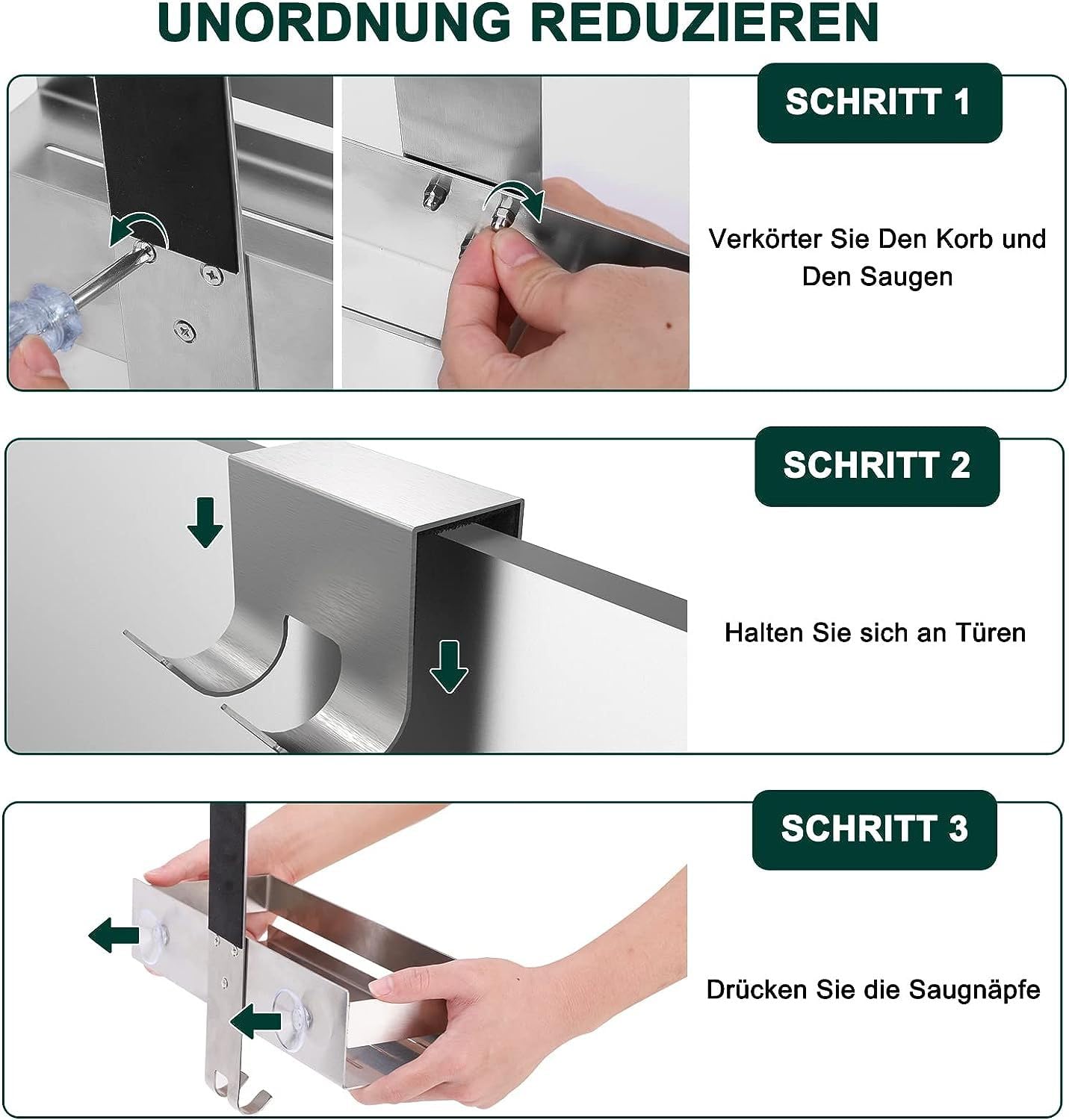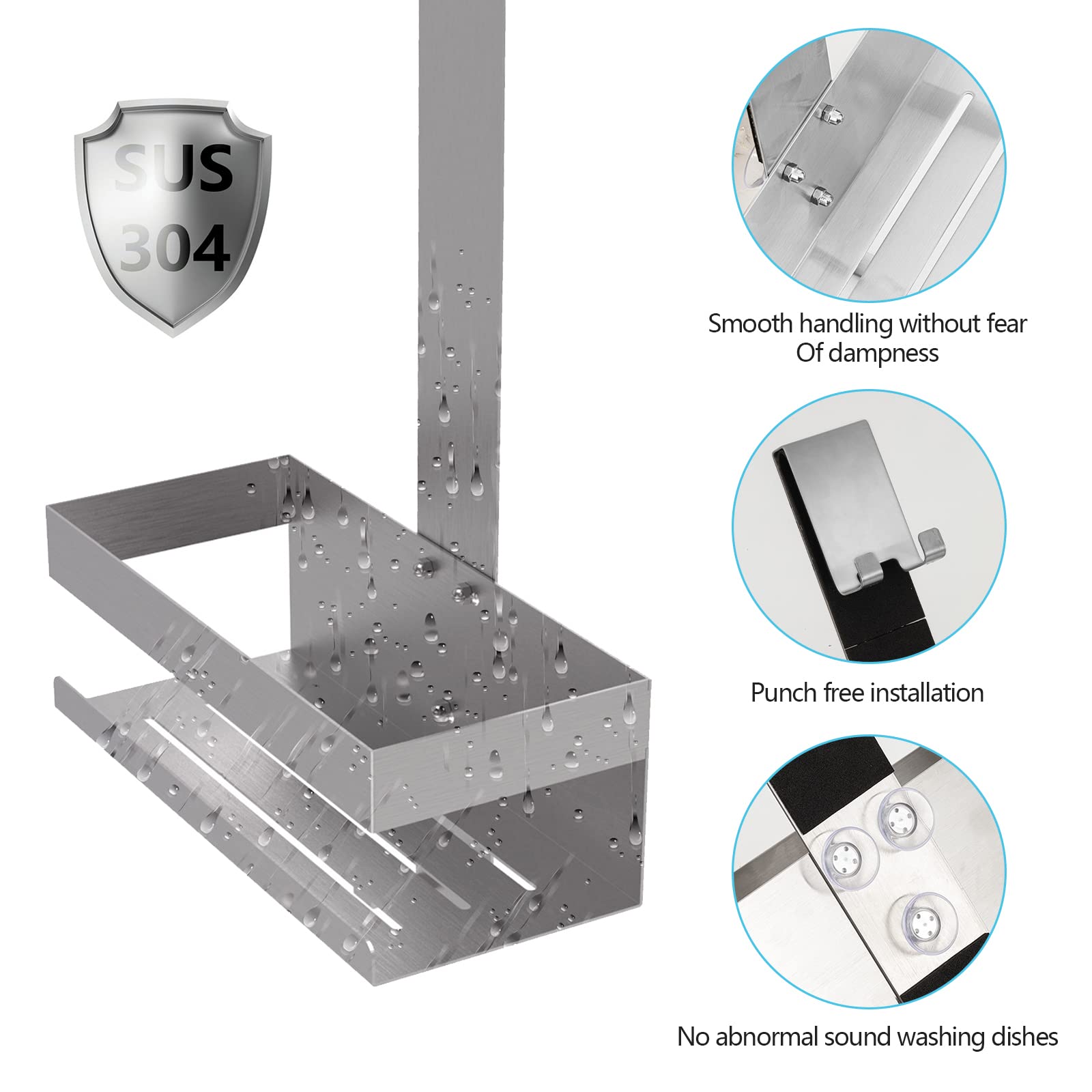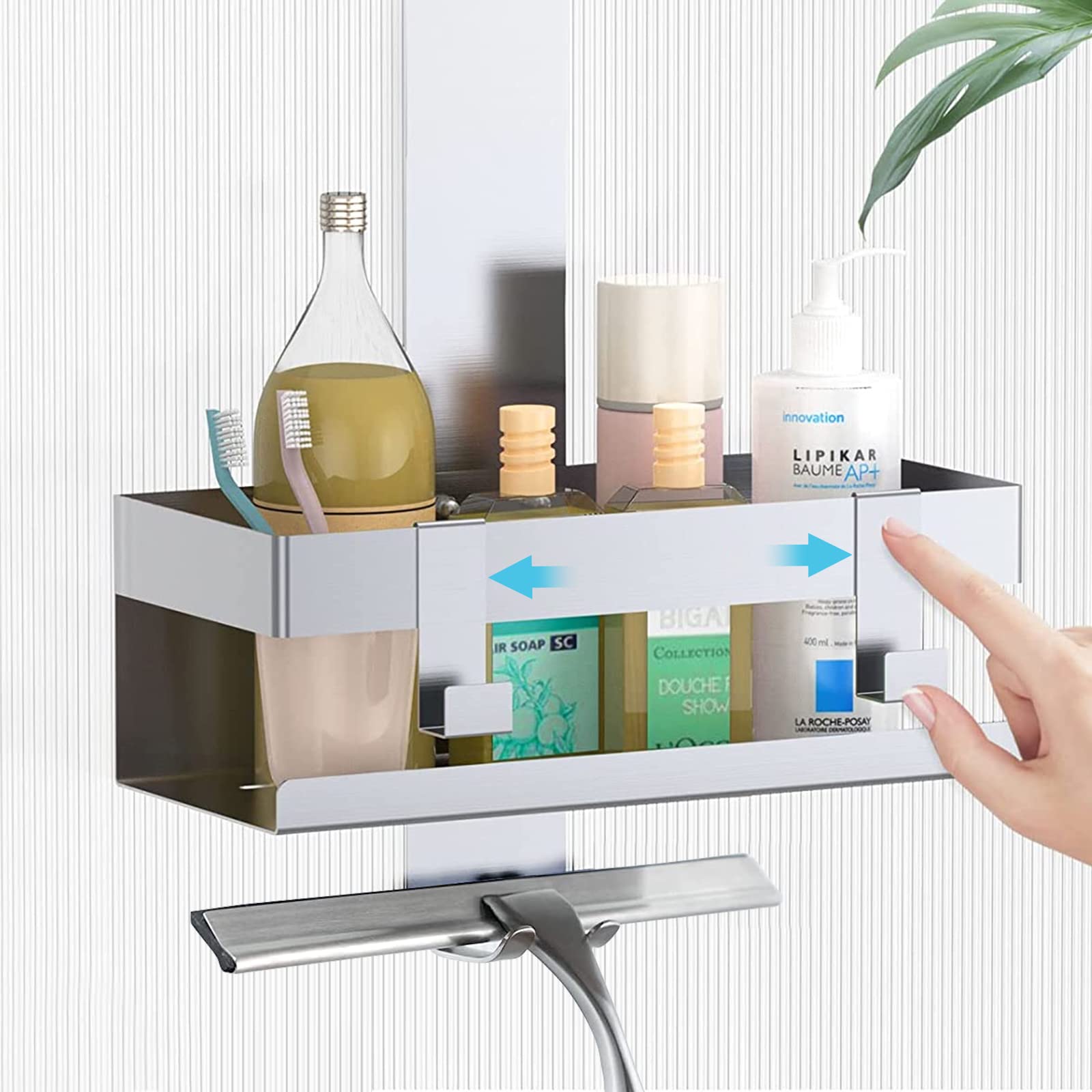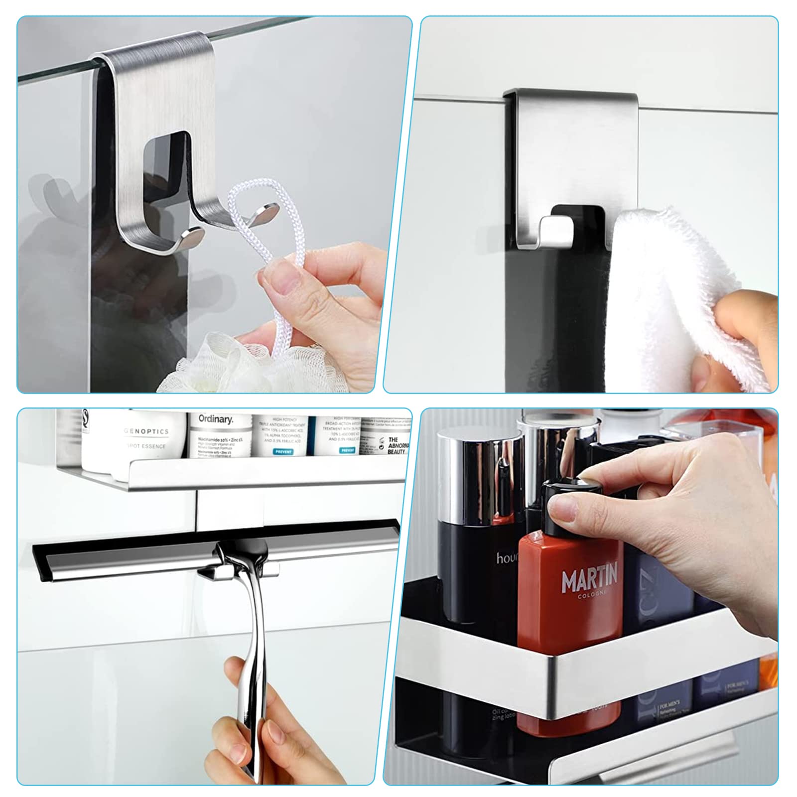 ["High Quality Shower Caddy Hanging from Stainless Steel SUS 304, rustproof and durable; Solid steel plate, strong balance and strong load-bearing capacity. The hanging shower caddy is hand-polished for smooth edges and a brushed nickel finish that complements almost any decor.","2-IN-1 Design Double hooks inside and outside, hanging shower caddy with two removable hooks can store shower gel, soap, shampoo, razor, etc. It can also be used to hang shower squeegees, towels, bathrobes, bath sponges, bath bombs, or clothing, efficiently utilizing vertical space and keeping the bathroom tidy.","Easy to install Simply align the shower basket and cylindrical bracket to quickly and conveniently disassemble and assemble. This drill-free shower caddy is easy to install. After installation, it can be directly hung on the glass door, without damaging the wall and also avoiding the danger of falling off from adhesive installation.","Larger Size Hanging plate for shower caddy: 40 cm, rubber protective pads on the back to protect the glass from noise. Shower caddy: 30 × 10 × 8 cm (L×W×H), can hold shower gel, facial cleanser, body lotion, shampoo, etc.","Fits Frameless Glass Doors Suitable for glass doors up to 12 mm thick. Please measure before ordering to ensure the top hooks fit your bathroom glass wall"]