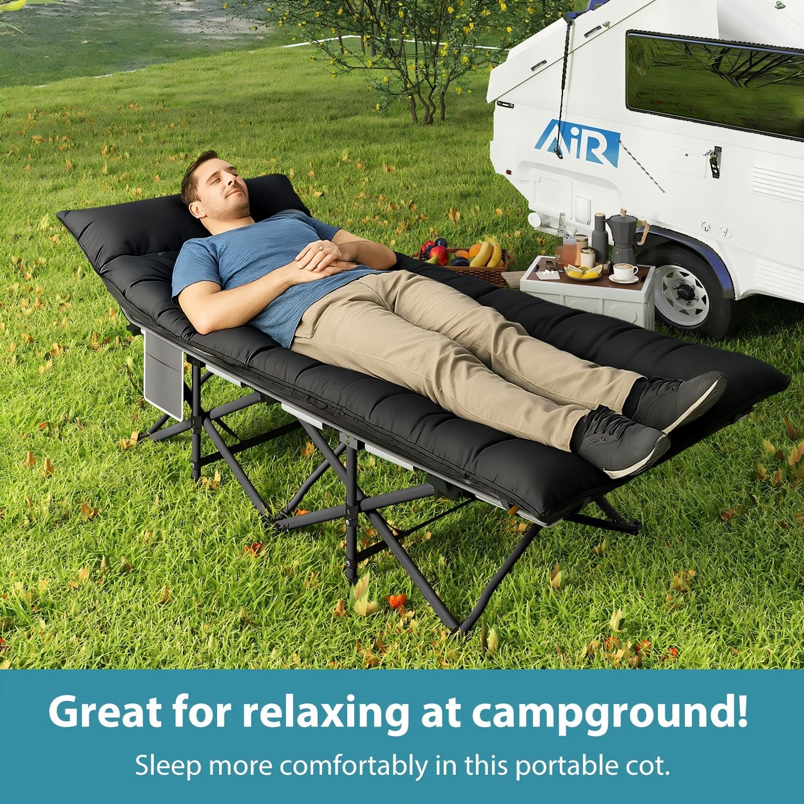 ["HEAVY-DUTY CAMPING BED XXL: Newfulam camping bed is made from a 3mm square anti-rust steel frame, durable thickened tubes, and double layer 1200D fabric. It is more durable and supportive than 600D Oxford cloth and can carry up to 400 kg. Superior strength, water resistance and easy to clean.","PORTABLE SIZE AND FOLDABLE: This is a portable camping bed without assembly, which unfolds in seconds and is ready to use. Spacious 190x81cm for a comfortable sleeping area. When not in use, simply fold it into a compact size of 25x105cm and transport it easily in the included carrying bag for outdoor adventures or as a guest bed.","REMOVABLE SKIN-FRIENDLY SLEEPING PAD: The Newfulam adult camping bed has a soft and removable mattress pad that provides more comfort and warmth while resting and sleeping. The pad is made of skin-friendly and comfortable fabric, suitable for people with sensitive skin or children. In hot weather, you can also remove the pillow.","FIT BODY CURVES: Our portable camping cot is designed with a slight elevation at the head end, which seamlessly adapts to the curves of the human body. This inclined structure ensures a more comfortable sleep, eliminates potential back, neck, or shoulder pain, and promises a better sleep experience for you.","WIDE APPLICATION: This portable folding bed has a large built-in side pocket where you can store your water bottle, phone, glasses, keys, books, toys, and more. This is a great camping bed suitable for both indoor and outdoor use. Perfect for camping, road trips, beach, backyard, park picnics. Additionally, they serve as comfortable guest beds at home and office beds for naps."]