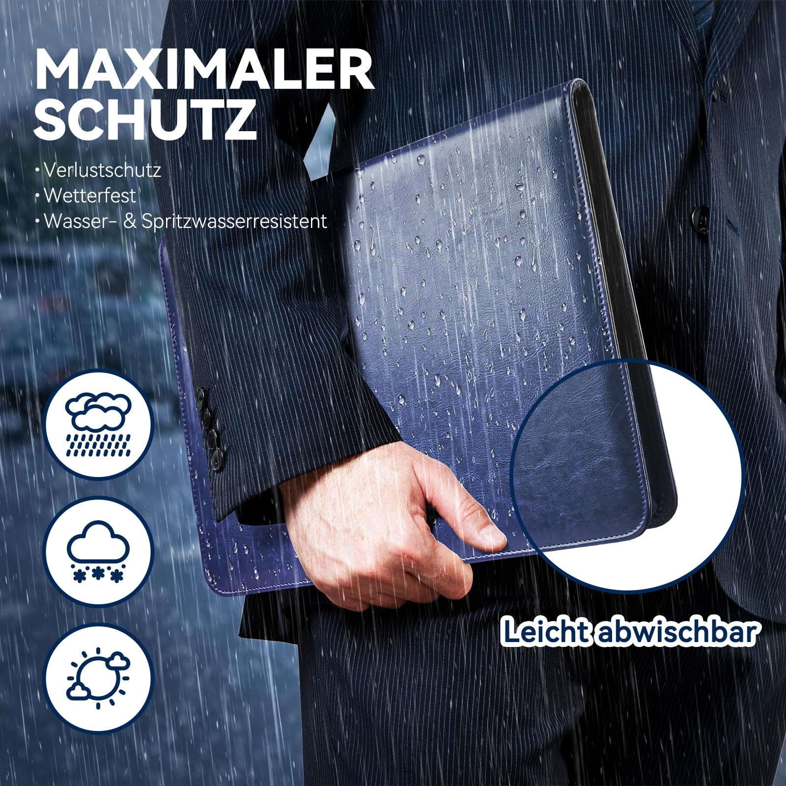 NEWYES A4 document folder, water-resistant with zipper & clipboard, faux leather portfolio perfect for business trips, teachers as a gift, or office use - Dark Blue.