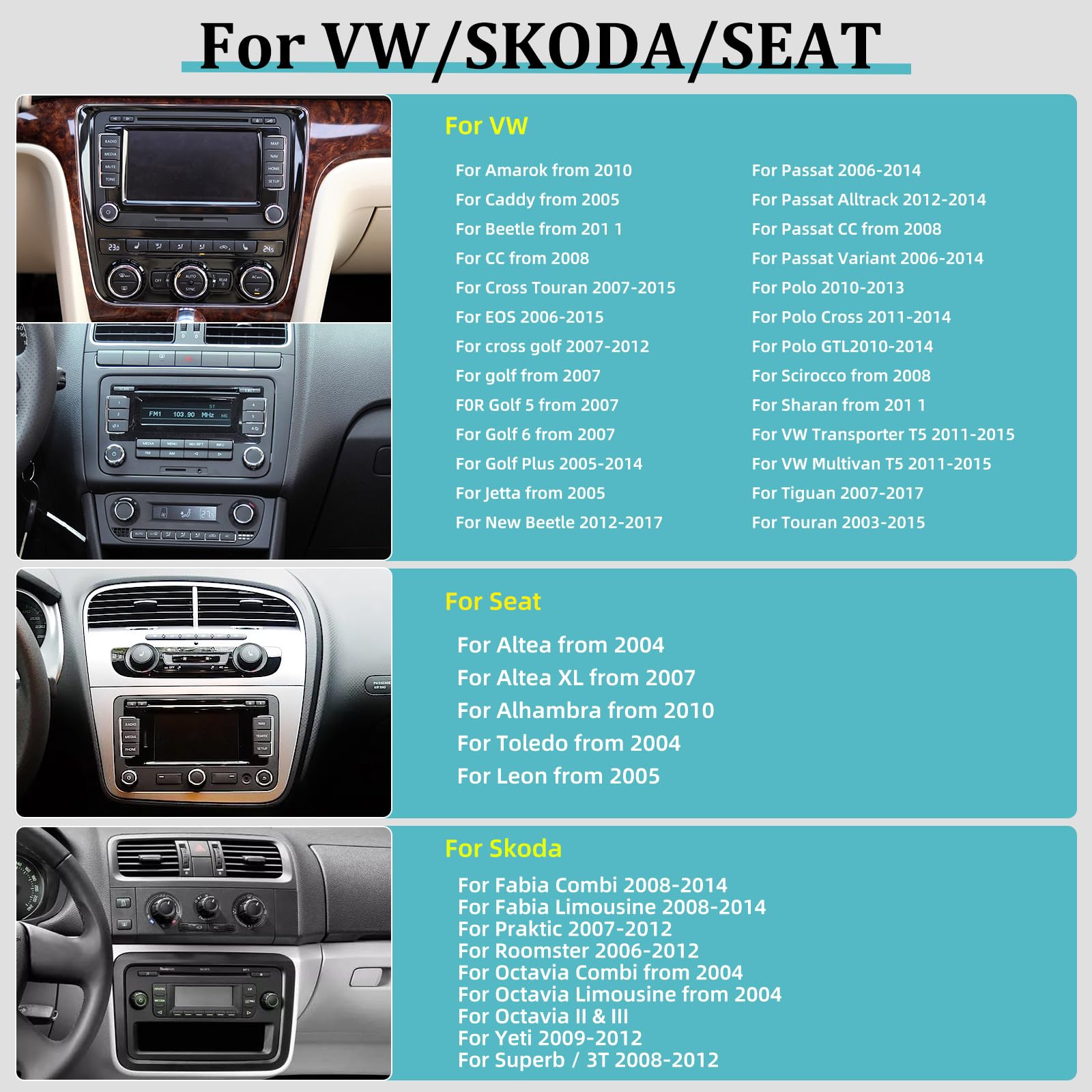 ["【Upgraded for VW Radio】Android operating system, 2GB RAM & 32GB ROM, plug & play installation. Suitable for VW Golf/Amarok/Caddy/Beetle/Jetta/Passat/Polo/Tiguan/Touran/CC/Sharan/T5/RCD 330 RCD 360, for Seat Altea/Alhambra/Toledo/Leon, for Skoda Octavia/Fabia/Praktic/Roomster/Yeti/Superb","【Wireless and wired Carplay & Android Auto】The Golf radio is compatible with the latest IOS and Android system, providing a smarter and safer way to use your mobile phone while driving. You can easily get directions, make hands-free calls, send and receive messages, and even enjoy your favorite music without taking your eyes off the road","【Excellent sound and screen quality】HD 9-inch capacitive touchscreen, resolution 1024 * 600, larger and clearer screen, offering you a wonderful visual experience. The Hi-Fi audio function also creates sound effects reminiscent of live concerts, allowing you to truly enjoy your music while driving. Support for subwoofer.","【Multifunctions】Supports both online and offline navigation, easy connection of WiFi and hotspot, Bluetooth hands-free calls / dual USB port / split-screen / steering wheel control / FM RDS radio / video and audio output with AHD backup camera and external microphone","【Worry-Free Guarantee】We offer 7 * 24 hours after-sales service. 30-day money-back guarantee, 2 years after-sales support. If the cable harness you receive does not fit, please contact us immediately and we will replace it with a suitable cable harness for free"]
