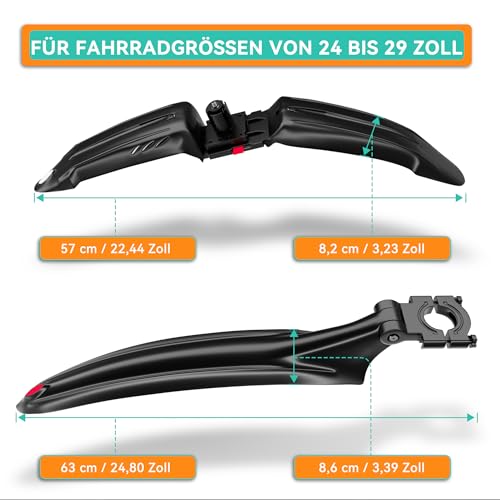 ["Front bike mudguard is installed in the round hole at the bottom of the front fork tube, suitable for the inner diameter of the round hole at the bottom of the front fork tube: 16-30 mm (0.63-1.81 inches). Rear bike mudguard is mounted on the seat post. Applicable seat post diameter: 28.6-31.8 mm (1.13-1.25 inches). Suitable bike tire sizes for front and rear MTB mudguard set: 24-29 inches. Protects cyclists from splashing mud and water: To meet the demands of cycling enthusiasts for a larger, mud-proof bike fender, the length and width of the mudguards have been increased and the arch shape improved, effectively protecting cyclists from mud, dirt, and road water. Highlight the personality of cycling enthusiasts: NICEDACK's design expands thickens mountain bike fenders combine design aesthetics with the aesthetic trends of cycling enthusiasts. While meeting the needs of cyclists for practical functions of bike fenders, it also meets their aesthetic requirements. Fender is perfectly integrated into the bike and emphasizes the taste and personality of the cyclist. Reduce bike cleaning: Mudguards can reduce the dirt splashing on the bike, reducing the cleaning and maintenance effort on your bike. At the same time, the smooth surface of the fender is also easy to clean. Simply rinse under running water and wipe. Easy to install: NICEDACK bike mudguard set comes with a detailed step-by-step installation guide, making installation quick and easy. Friendly reminder: If you encounter any problems, you can contact us and we will respond as soon as possible."]