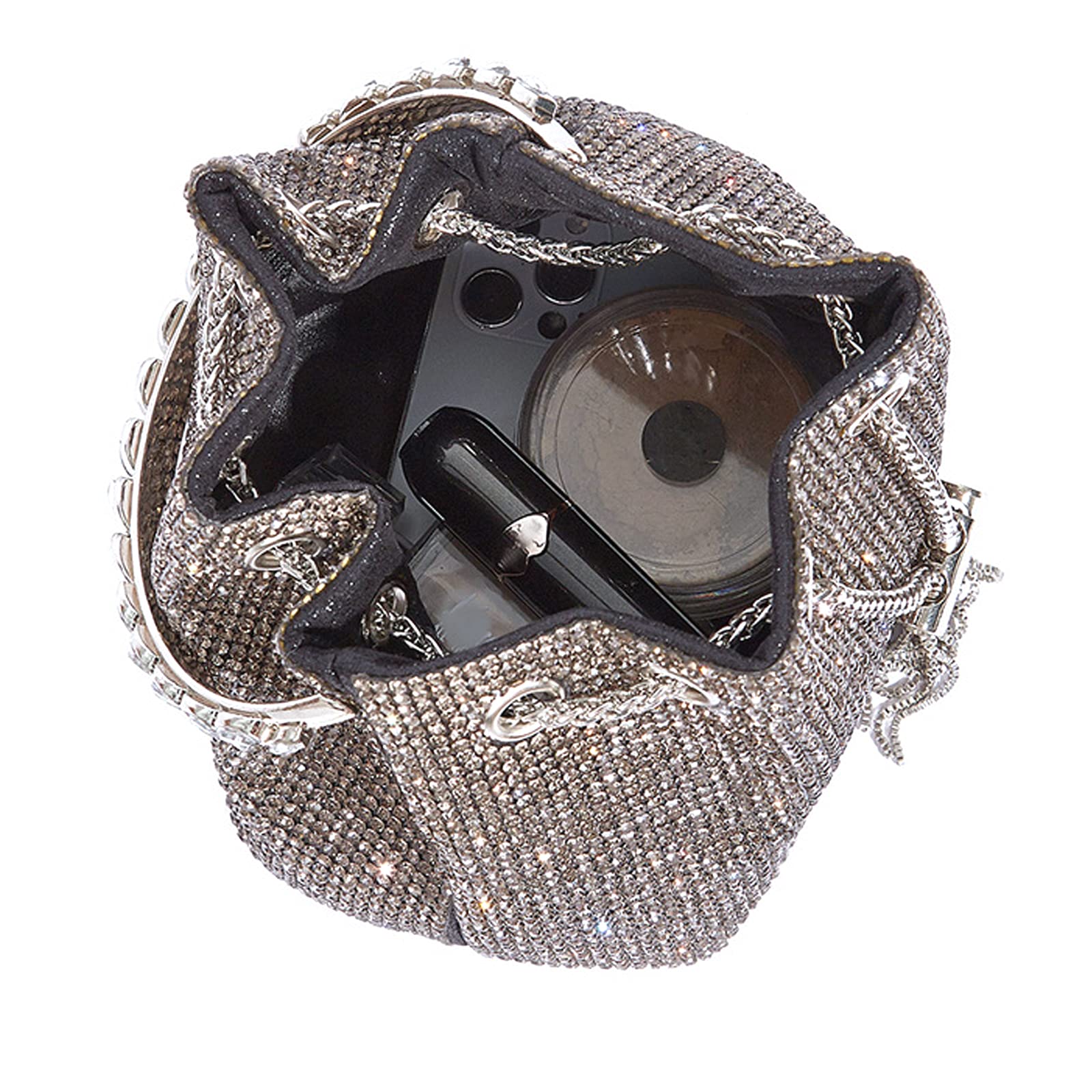 ["High-quality Materials: This beautiful clutch bag bucket bag is full of sparkling crystal rhinestones, chic and unique. This evening handbag will make you look elegant and a compelling focus in the party.","Multifunctional: The clutch handbag is equipped with a detachable long chain, so the clutch can also be used as a bracelet purse, handbag, shoulder bag, and crossbody purse. Also use round rhinestone handle as a handbag.","Perfect Size: Length 16cm (6.2") Width 10cm (3.9"), Height 14.5cm (5.7"). Just the right size for most needed items, such as iphone, keys, card wallet, compact mirror, lipstick, lip gloss, and other small items.","Suitable for any occasion: This beautiful clutch is perfect for weekends, weddings, evening parties, balls, cocktail parties, nights, and other formal or informal occasions. It is the perfect gift for Valentine's Day, Mother's Day, Thanksgiving, and Christmas.","After-sales Service: NICOLE & DORIS is committed to providing comprehensive service to every customer, if you have any dissatisfaction or questions about the product, feel free to contact us. The warranty period for the bag is 12 months."]