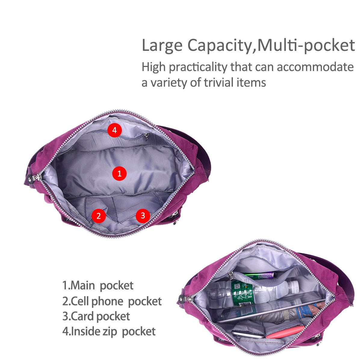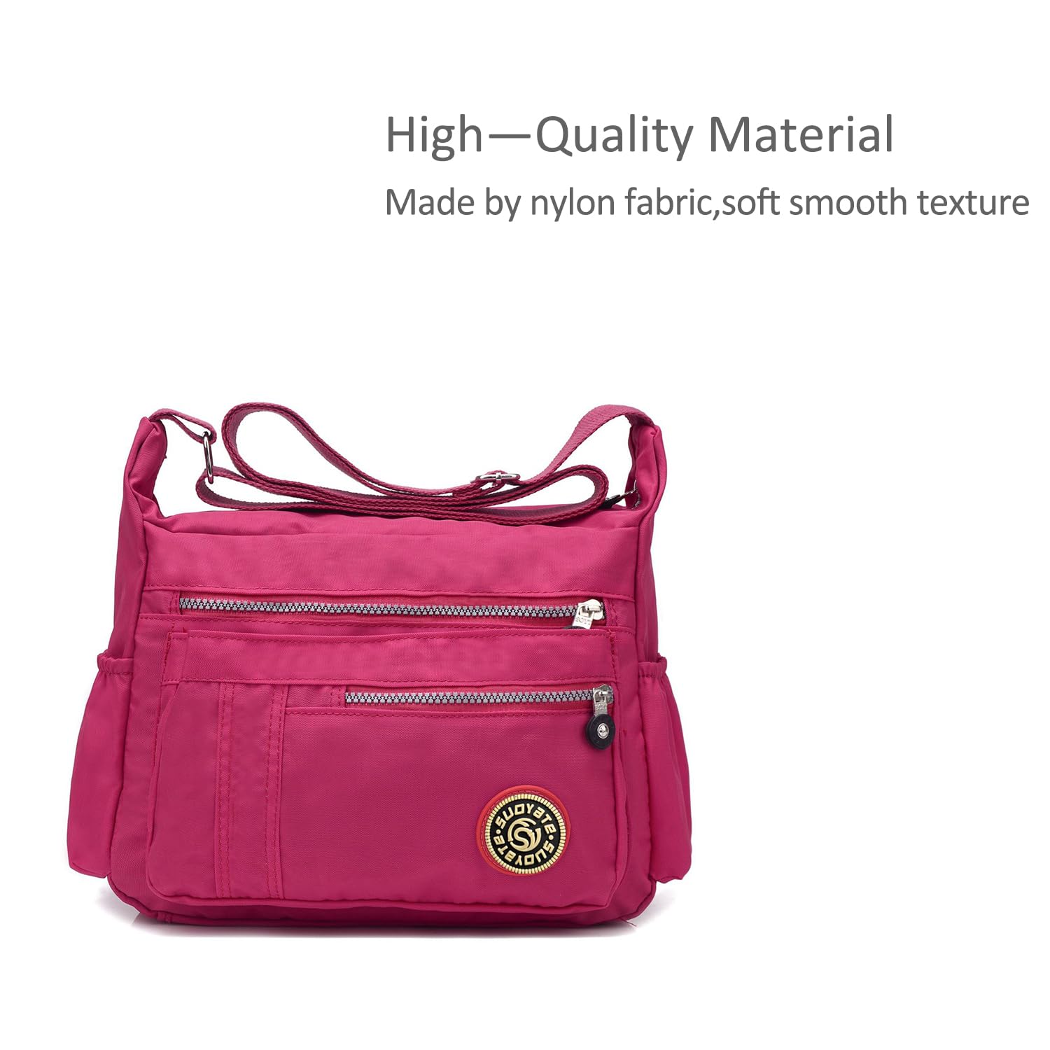 ["Dimensions (L x W x H): 14 x 5 x 9 inches.", "Material: high-quality, lightweight, waterproof nylon with fabric lining.", "Interior: 1 main compartment, 2 open card slots, 1 interior zip pocket. Large capacity holds an iPad, wallet, phone, and other items comfortably.", "Exterior: Classic solid color with exquisite ornament. Can be used as a shoulder bag or crossbody bag.", "Occasion: Fashionable and stylish design for women for work, party, business, school, travel, dating, shopping, or daily use. Perfect as a birthday gift, Christmas gift for women, mother, ladies, friends, or colleagues."]