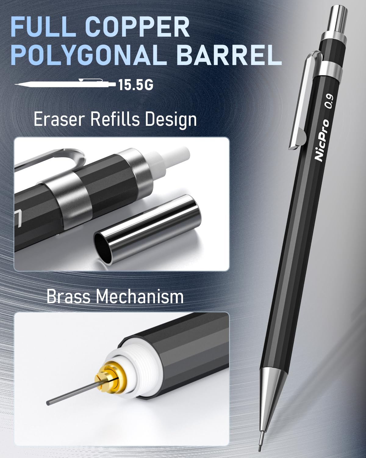 ["34-piece artist set: 4 x HB mechanical pencils made of full metal and 2 x 2 mm lead holders, 19 tubes of leads including 8 tubes of HB lead in 0.3 mm & 0.5 mm & 0.7 mm and 0.9 mm, 9 tubes of 2 mm (6B 4B 2B HB 2H 4H) graphite leads and 2 tubes of colored leads, 3 x 4B erasers, 1 x kneaded eraser, 18 x eraser refill packs, 2 x sharpeners, all neatly stored in a case with flocked tray. A gift for friends and family","Unique design: The full metal HB pencils come with a polygonal shaft that is comfortable to hold and non-slip in the hand. Equipped with eraser refill leads to ensure precise erasing of handwriting. The 4 mm tip length makes them ideal for use with rulers and templates. Various line sizes (0.3 mm, 0.5 mm, 0.7 mm, and 0.9 mm) meet your daily needs","2 pieces of 2 mm lead holders: non-slip pen tube with metal thread, featuring a sharpener design that allows you to sharpen the pencil lead anytime. The 2.0 mm graphite leads are available in 6B, 4B, 2B, HB, 2H, 4H, and colors, perfect for sketching in different shades and drawing","Good weight and smooth writing: These pencils are made of full brass metal body and offer a nice weight balance for fatigue-free writing and drawing. Ideal for artists, professionals, teachers, and students alike. Convenient to carry your entire mechanical pencil set anywhere. Perfect for writing, drawing, sketching,","3 types of erasers: Nicpro latex-free 4B erasers, remove pencil marks without damaging the paper, no smudges, no ghosting, tear or harden with age, remain soft and ready to use. The kneaded eraser can easily be molded into the shape and size you like, perfect for correcting and brightening charcoal, pencil, and pastel colors","100% RISK-FREE PURCHASE: If you are not satisfied with the Nicpro mechanical pencil set, we are happy to offer you a refund or replacement. Order risk-free today"]