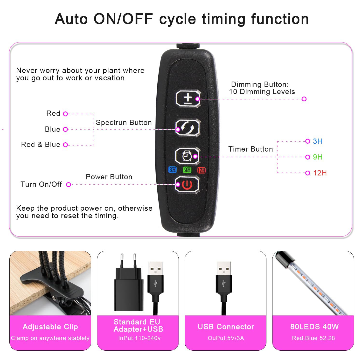 [LED plant light with automatic on/off and memory function] Plant light with 3 timer settings (3H / 9H / 12H). Once set, the plant light will automatically turn on and off every day. Let your favorite plants be taken care of even during holidays or weekends. Grow light for vegetative phase: 9 hours, flowering phase/fruit formation: 12 hours.