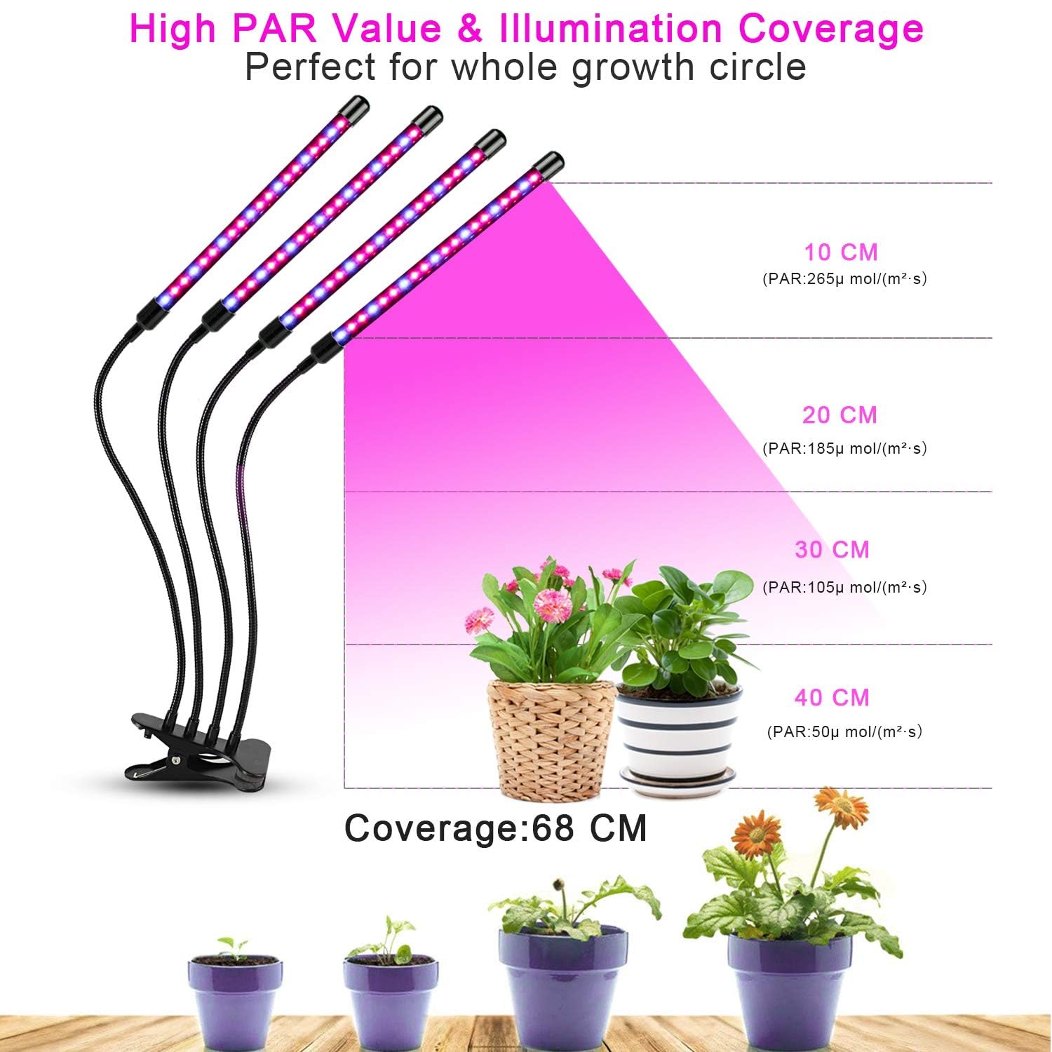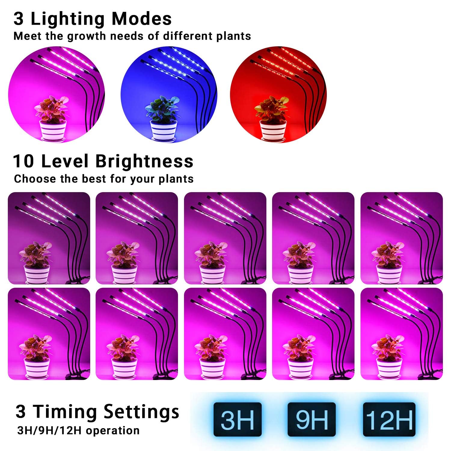 [Latest plant growth light for 4 heads and full spectrum LED plant light and 3 lighting modes and 10 dimming levels] Plant light LED is designed with 4 goosenecks, providing much larger coverage than full spectrum LED plant light with shorter LED bulbs on the market. You can not only set 3/9/12H, but also adjust the brightness of the light and the distance between light and plants according to the plants' needs.